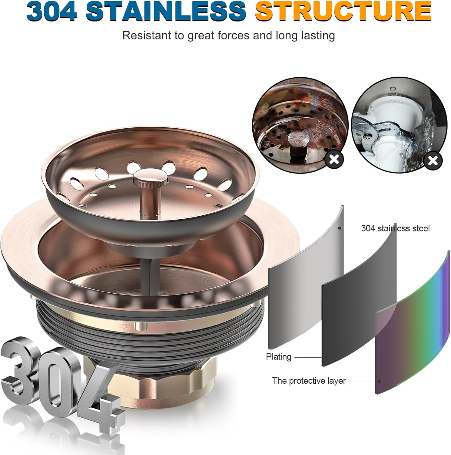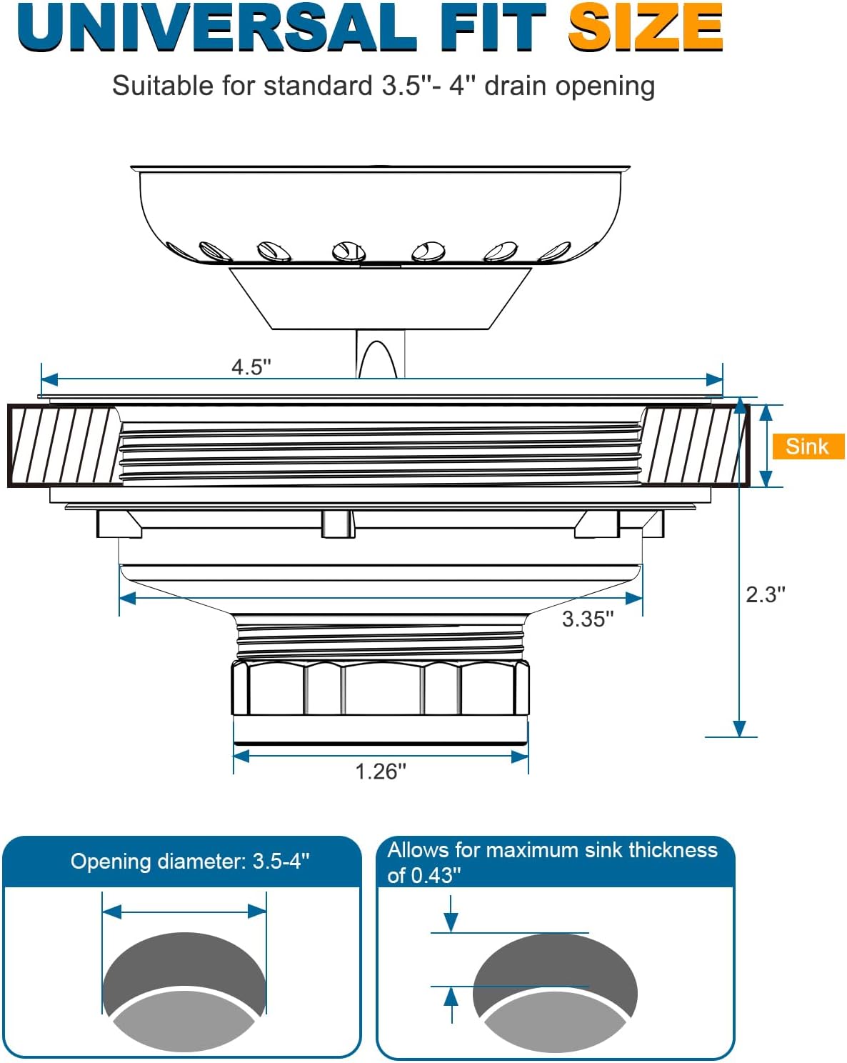 • BUILT TO LAST -- Kitchen drain assembly is made of 304 stainless steel, which is durable, rust and corrosion resistant. Perfectly fits most US home and commercial kitchen sinks with a 3.5" drain hole and supports up to 0.43" sink thickness