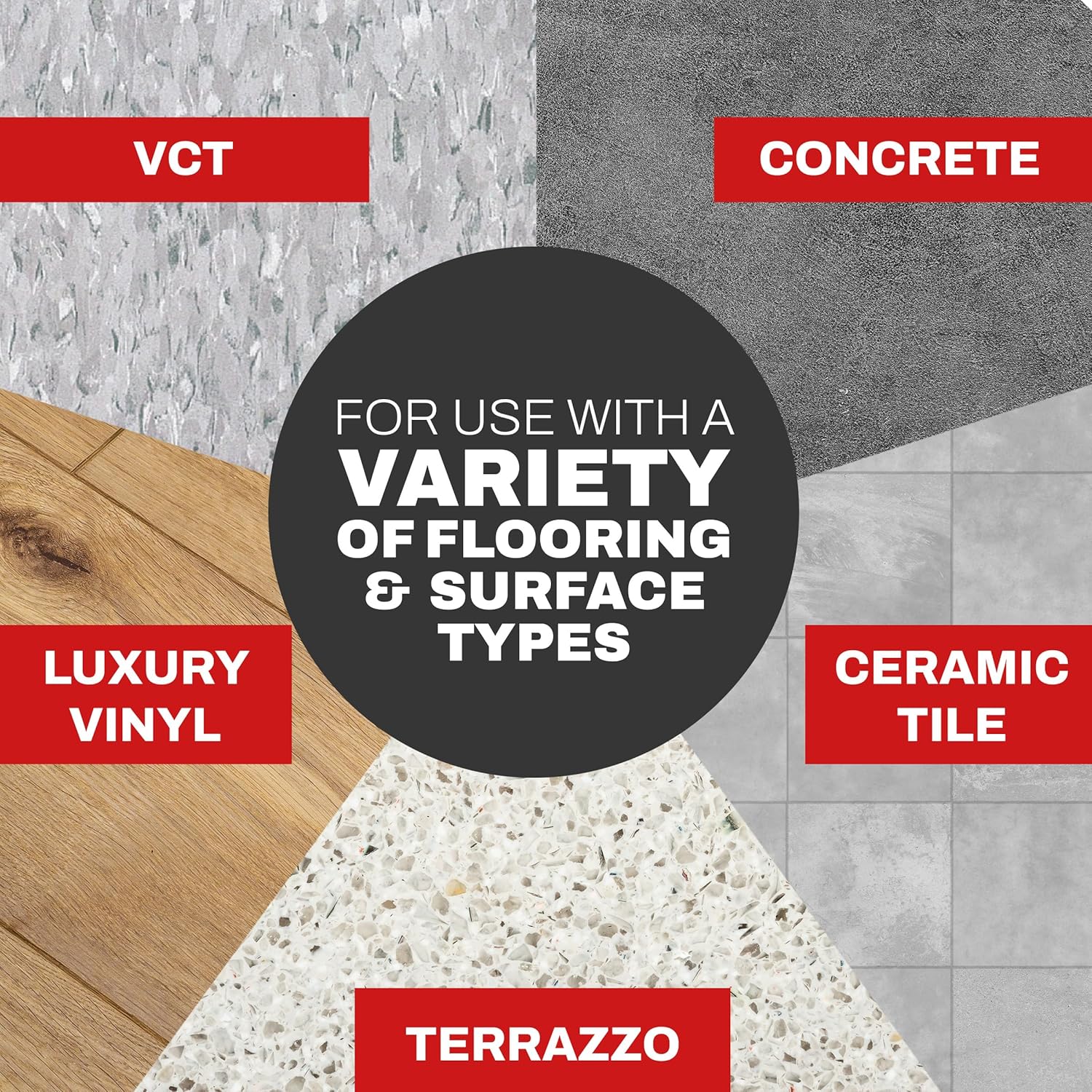 • Use on a variety of flooring surfaces like vinyl composite (VCT), luxury vinyl tile (LVT), vinyl asphalt, vinyl asbestos, sheet vinyl, rubber, linoleum, terrazzo, marble, granite, concrete, ceramic, sealed wood, natural stone, brick, slate and quarry tile
