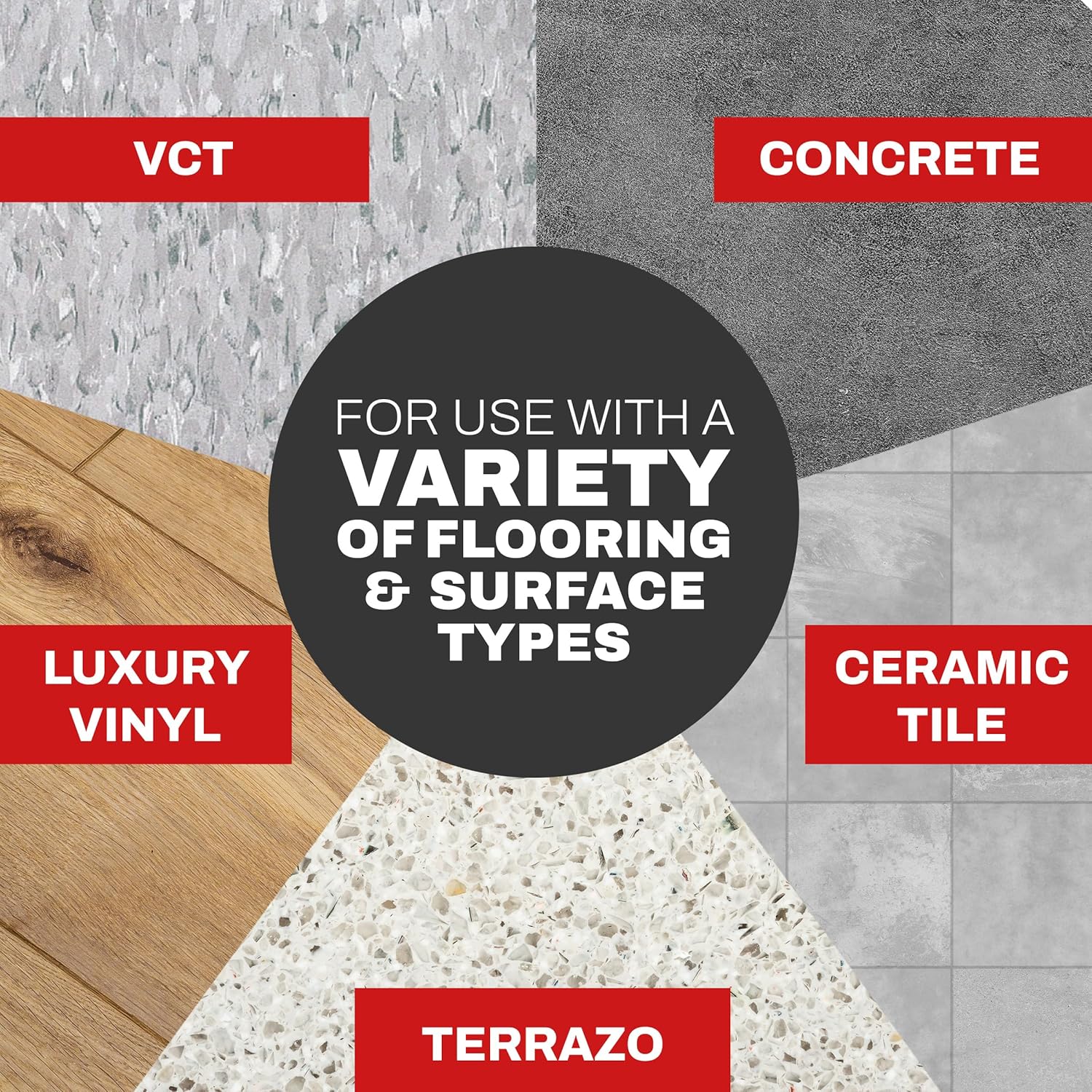 • For use on a variety of flooring types such as vinyl composite, vinyl asphalt, vinyl asbestos, 100% sheet vinyl, terrazzo, rubber, linoleum, marble, granite, concrete and sealed wood floors.