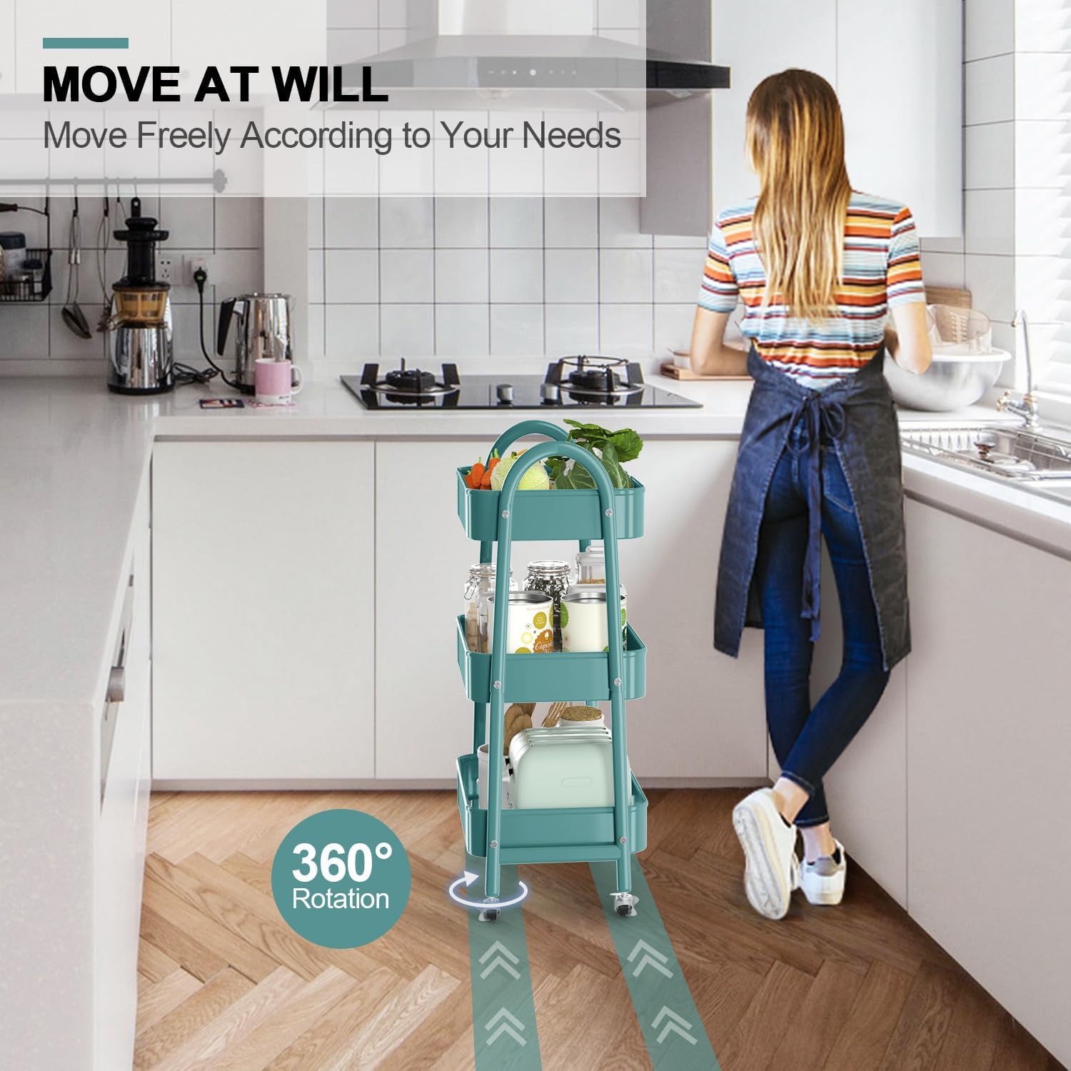 - Move or Lock At Your Will: Our rolling cart is equipped with 4 360° rotating wheels, easy to carry around and change place at will, two of wheels are lockable, provide stability. The modern curved handles design makes it more convenient to push and pull around as needed.
