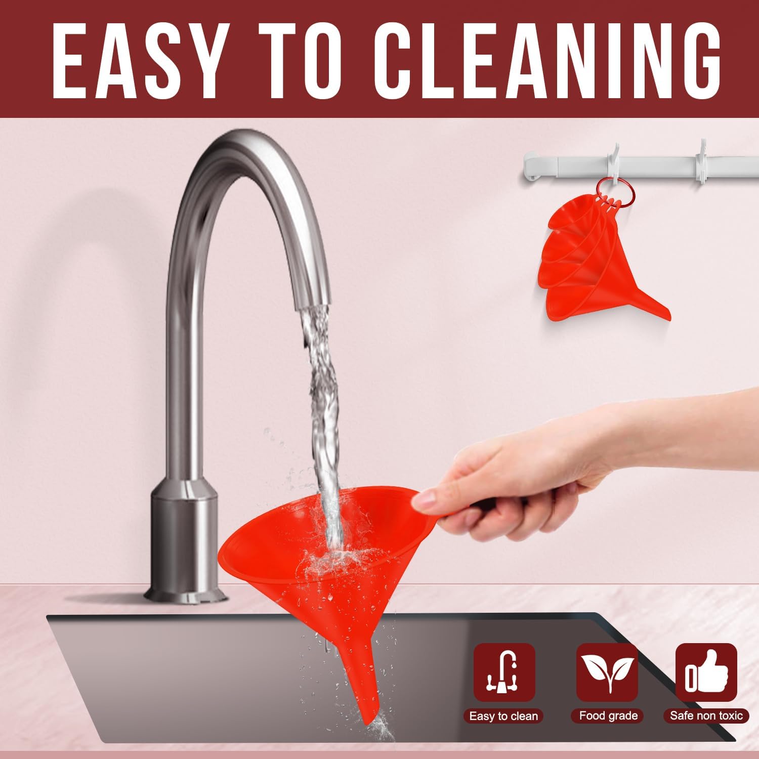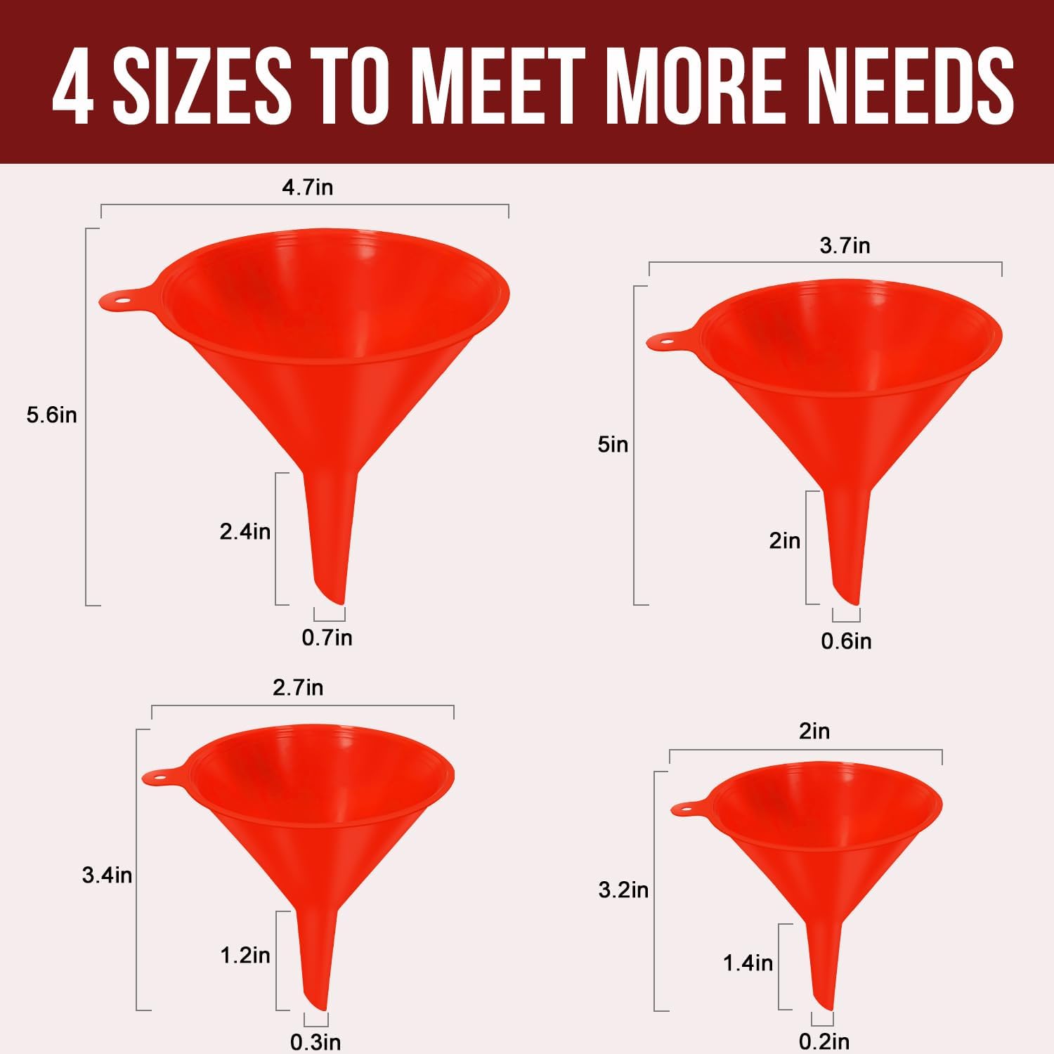 • 【Multi-size & multi-purpose】: 4 plastic funnels (4.7"、3.7"、2.7”、2")of different sizes to pour liquids, essential oils, fragrances and even powders into bottles, containers and jars of various sizes for use in places such as car care, cleaning, restaurants, schools and laboratories