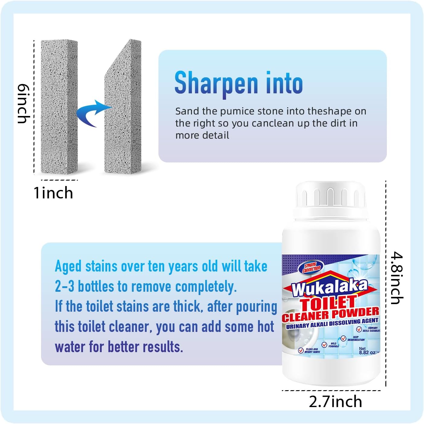 • 2.Instructions:Product 1 wet the pumice stone first for 15 to 20 seconds, then test in a small area, keep the pumice scrubber and toilet surface moist throughout use, and then wipe clockwise to easily remove the dirt. Product 2 will not produce foam. After pouring into the toilets, wait for 3 hours and rinse with water, it will become very clean.