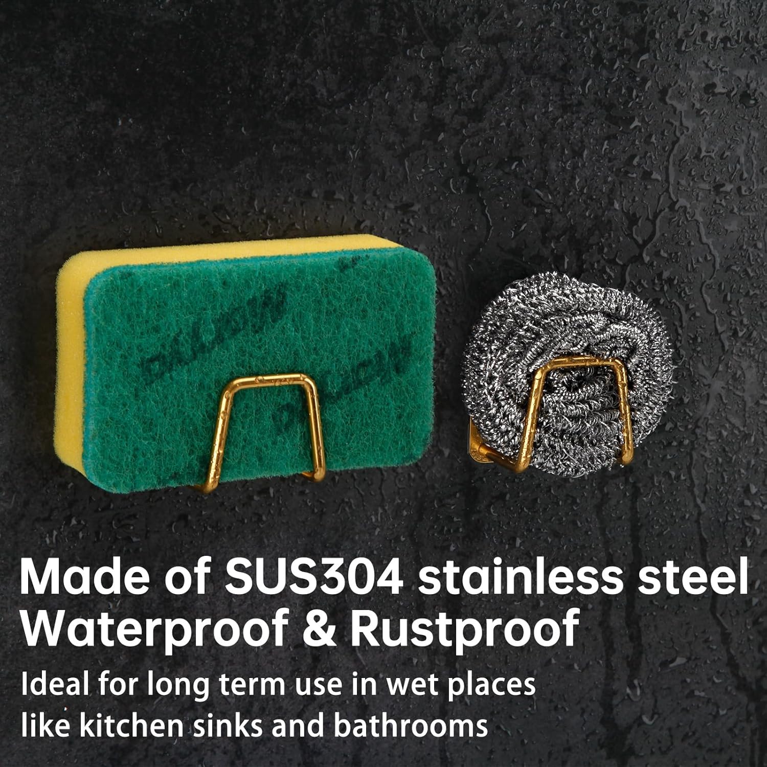 2Pcs Adhesive Sponge Holder for Kitchen Sink Essentials, Stainless Steel Dish Soap Holder, Rustproof and Waterproof, Quick Drying, Minimal Size Saves Space, Gold