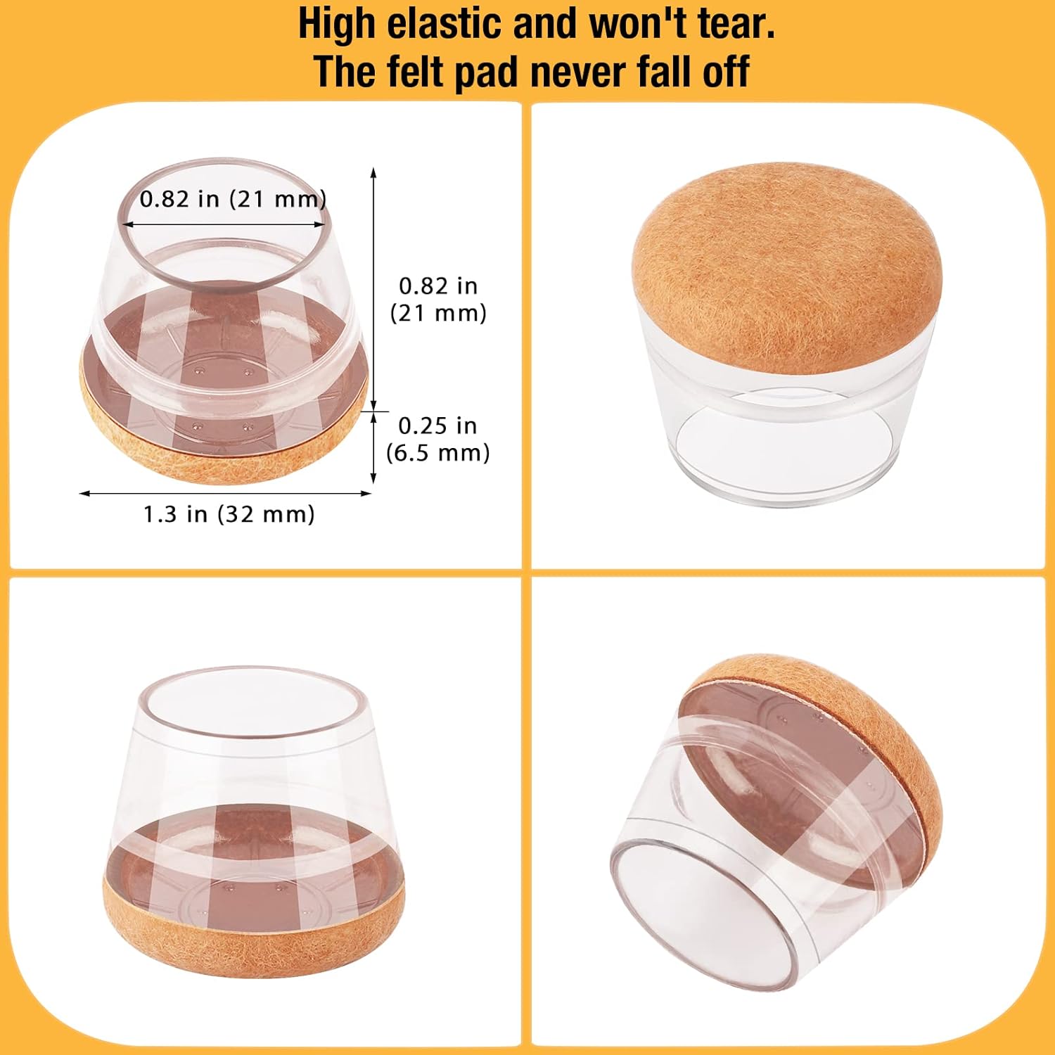 • 【Upgrade New Design】: 360° full felt pad bottom wrapped, which helps the felt bottom be able to touch the floor at any angle, preventing scratching the floor. Our chair leg floor protectors do not use gel. The bottom felt pad and the silicone chair leg floor protectors are integrated with a high-pressure machine to ensure that they will never fall off.