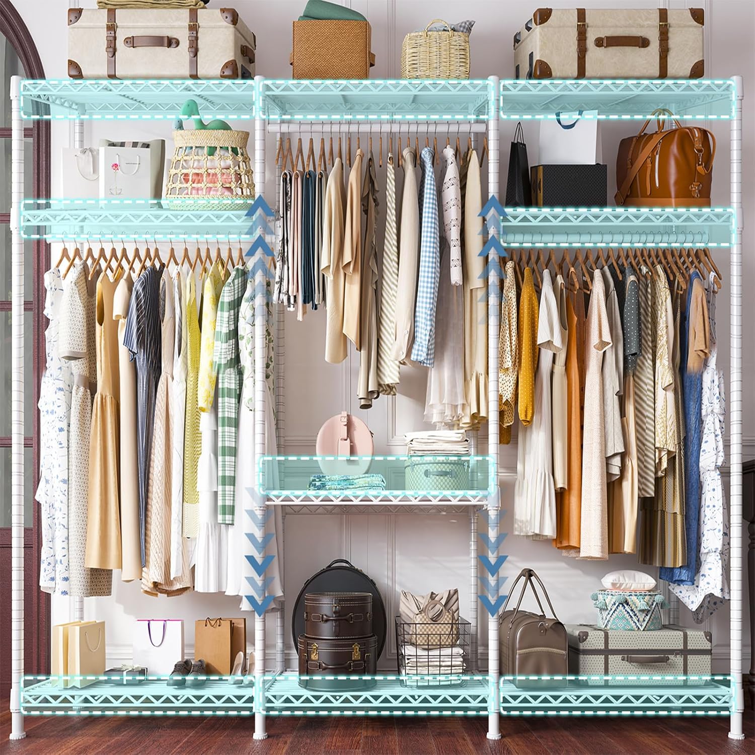 - 【9 Adjustable Shelves & 3 Detachable Hangers】The garment rack for hanging clothes are all easily adjustable and detachable by the slip-sleeve locking system, all you need to do is assemble the clips higher or lower. 9 shelves can put luggage, quilt, storage box or shoes, etc. 3 Metal hangers can hang long dress or coats saving and keeps room clean and tidy. A perfect DIY portable clothes rack meets all needs.