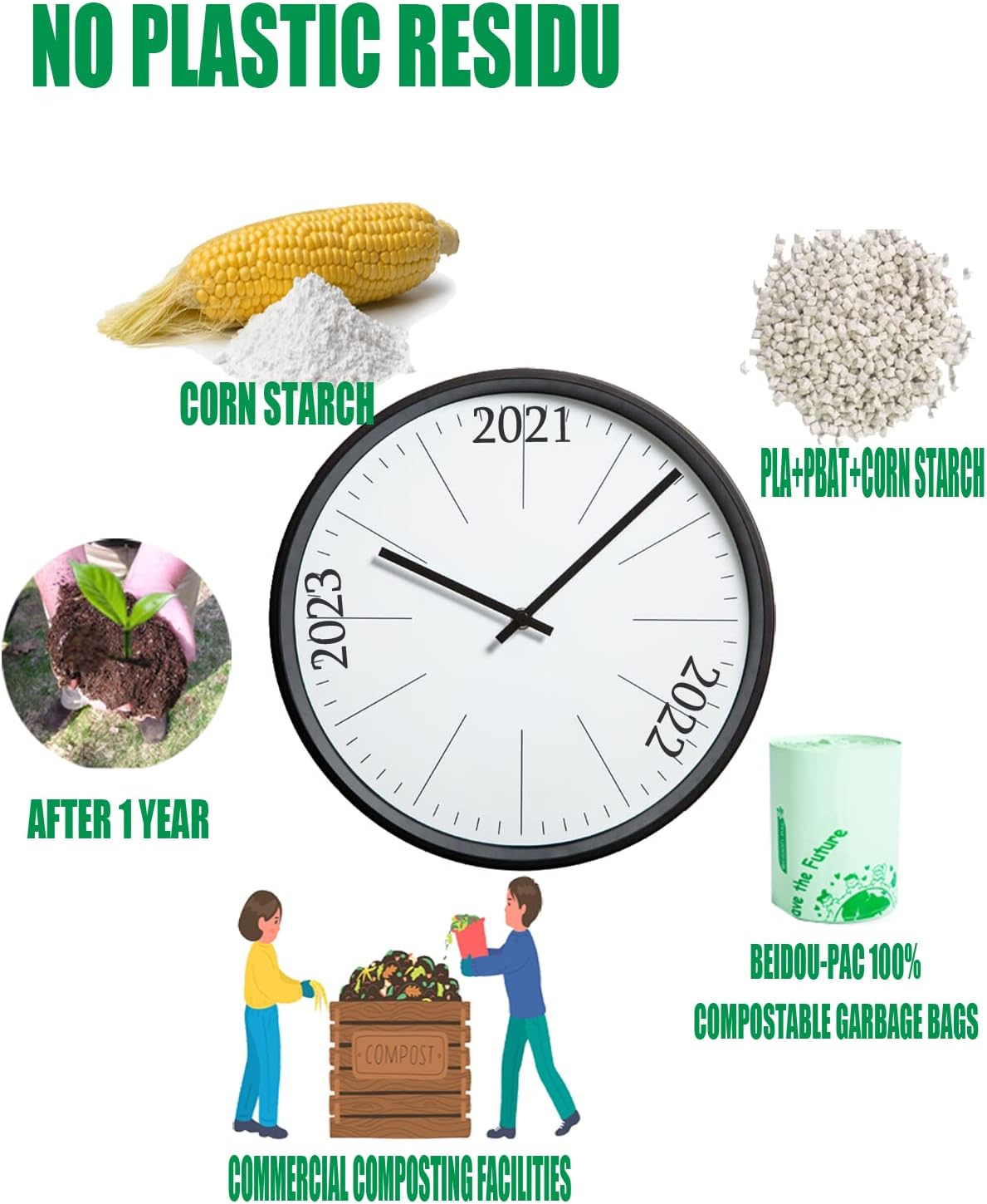 - [SAFE & NO PLASTIC RESIDU] -- BEIDOU-PAC 100% Certified Compostable Kitchen Food Scrap Bags, Kitchen Compost Bin Compatible, are safer for the environment, which are mainly made from PBAT & PLA & Vegetable starch like corn, and completely degrade into biomass, water and CO2. after 1 year when placed in both home and commercial composting facilities. 100% compostable food waste bin bags are made from plant vegetable and 100% return back to earth.