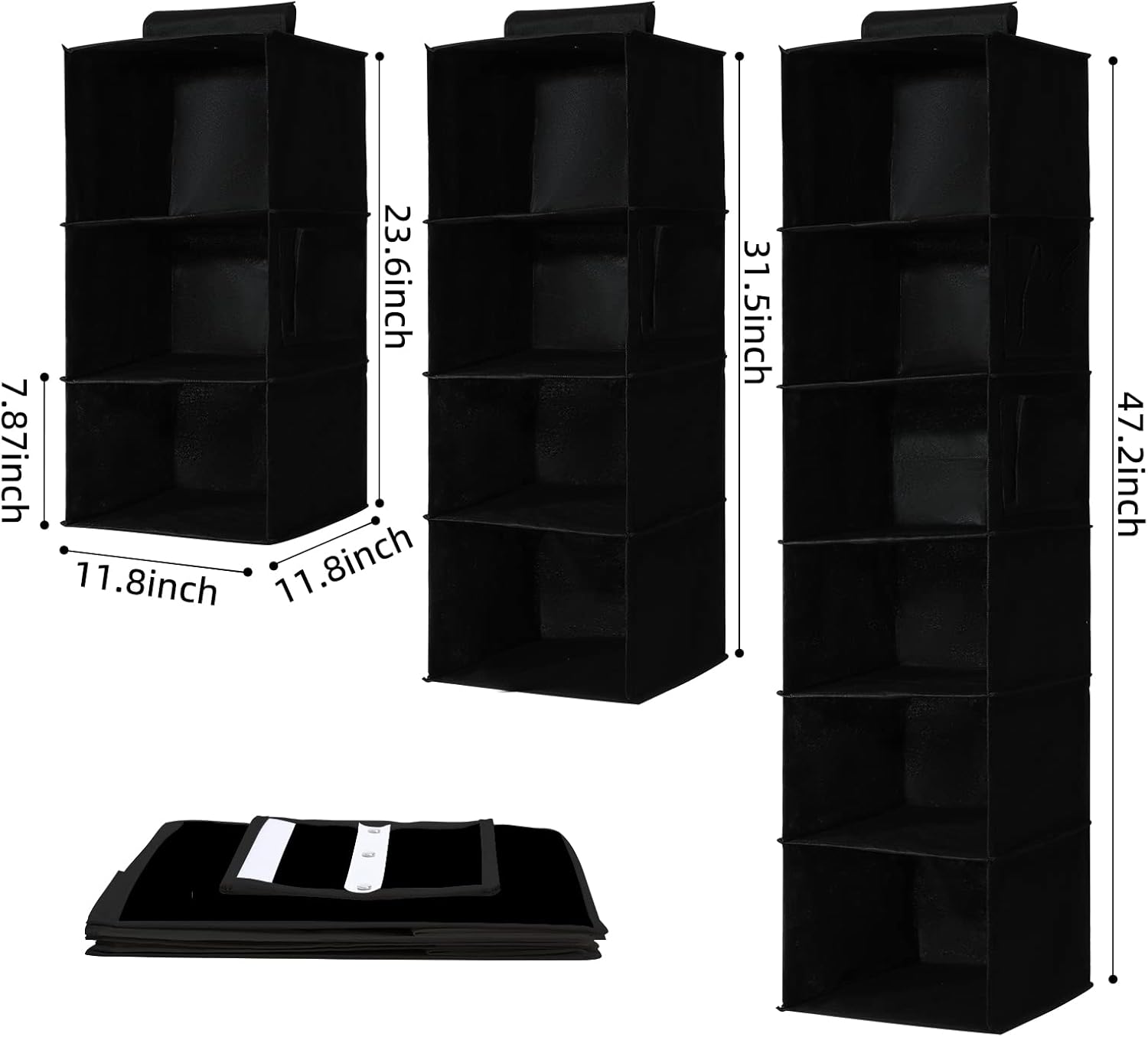 - 【Product Dimensions】You will get 2 packs of hanging shelves. This overall size is 11.8"(L)*11.8"(W)*47.2"(H). Each unit is 11.8"(L)*11.8"(W)*7.87"(H).Before buying, it is recommended to measure the distance between your closet rod and the floor to see which model would be best for you.
