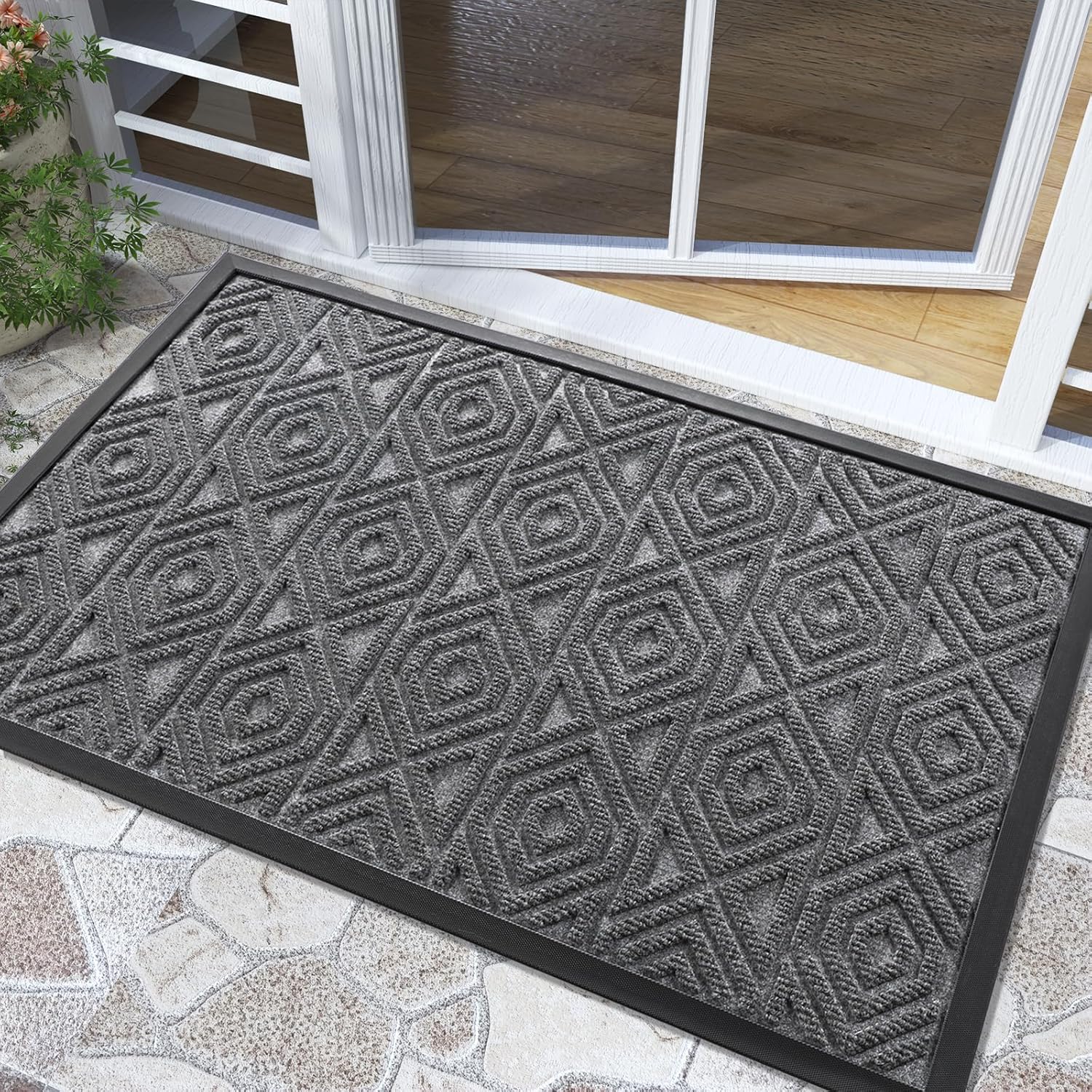 - [CAPTURE DIRT AND MOISTURE] Yimobra front door entryway mat outdoor with unique pattern design, forming a detention dam extending in all directions, helping to capture dirt, dust, gravel, mud, sand, grass or other messy debris and prevent them from entering Indoor; The surface of floor mat beautifully woven polyester fabric absorbs moisture, and the sturdy oblique rubber edge will not accumulate water in rainy and snowy days, keeping your home dry and clean