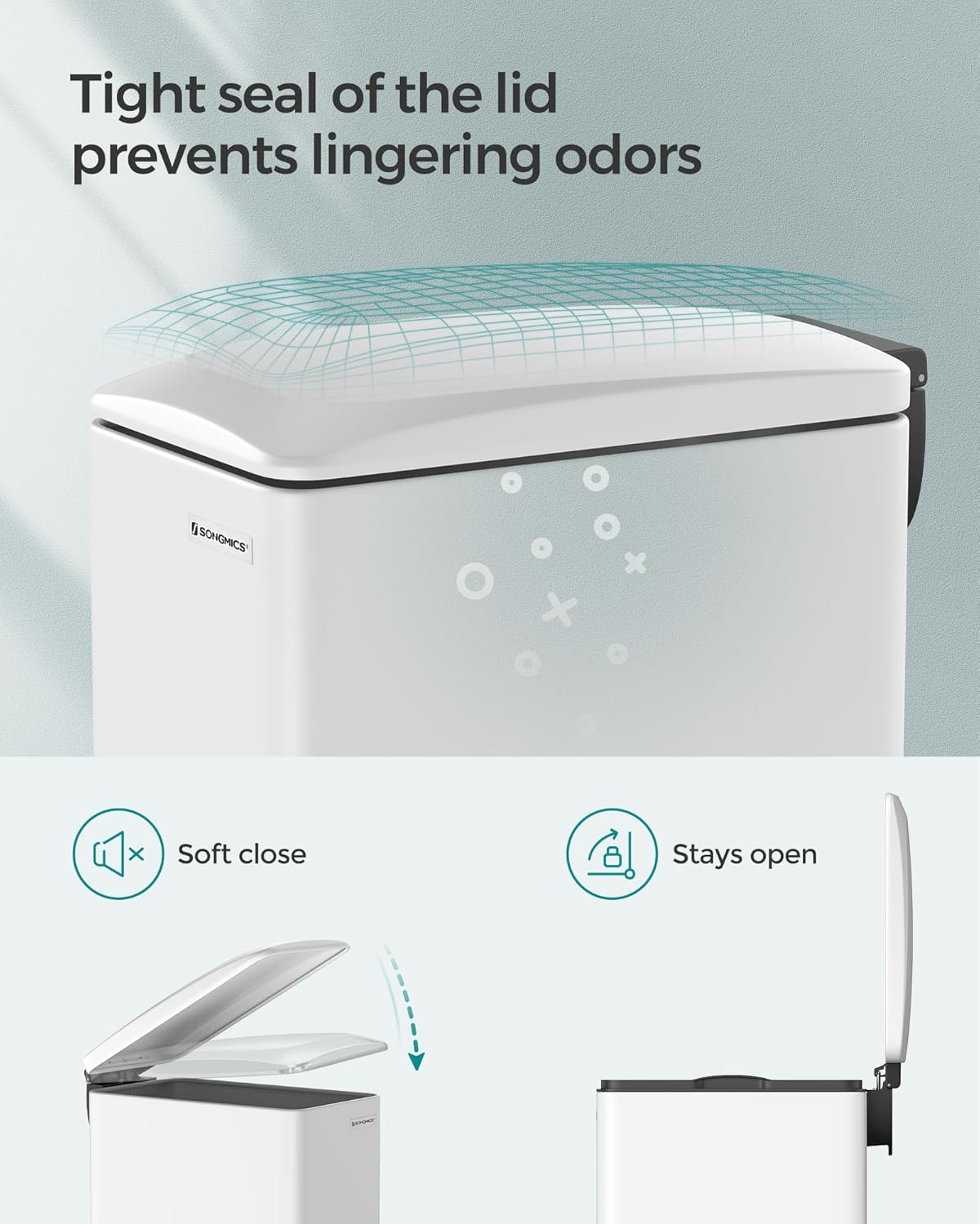 • [Closes Softly & Stays Open] This garbage can features a silent and soft close lid that can seal stinky smells inside. The lid can be kept open for bigger jobs by using your hand to open the lid to a catch point