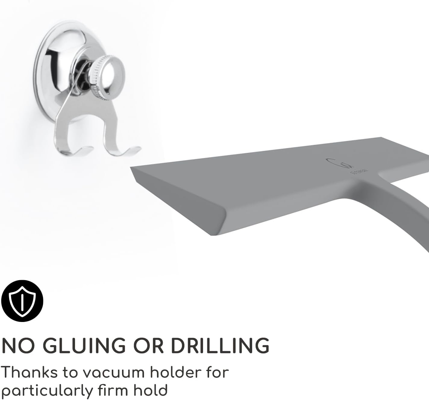 • SUPER STRONG SUCTION HOOK - No drilling or gluing required! You can easily remove and reattach the squeegee stainless steel hook to smooth surfaces such as panes, tiles, shower walls, shower glass surfaces, doors, cubicles, and enclosures.
