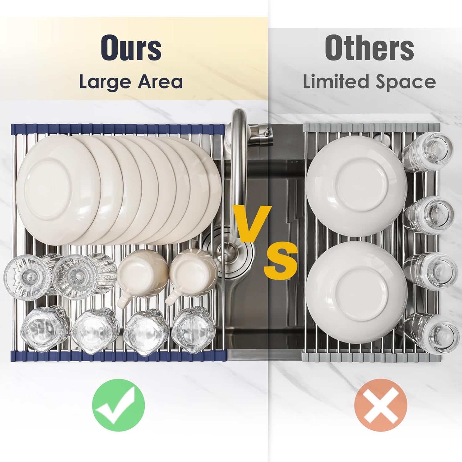 Tomorotec 21" x 15.5" Roll Up Dish Drying Rack Over Sink Drying Rack Sink Cover Kitchen Sink Accessories Gadget Multipurpose Organizer Foldable Stainless Steel Drainer
