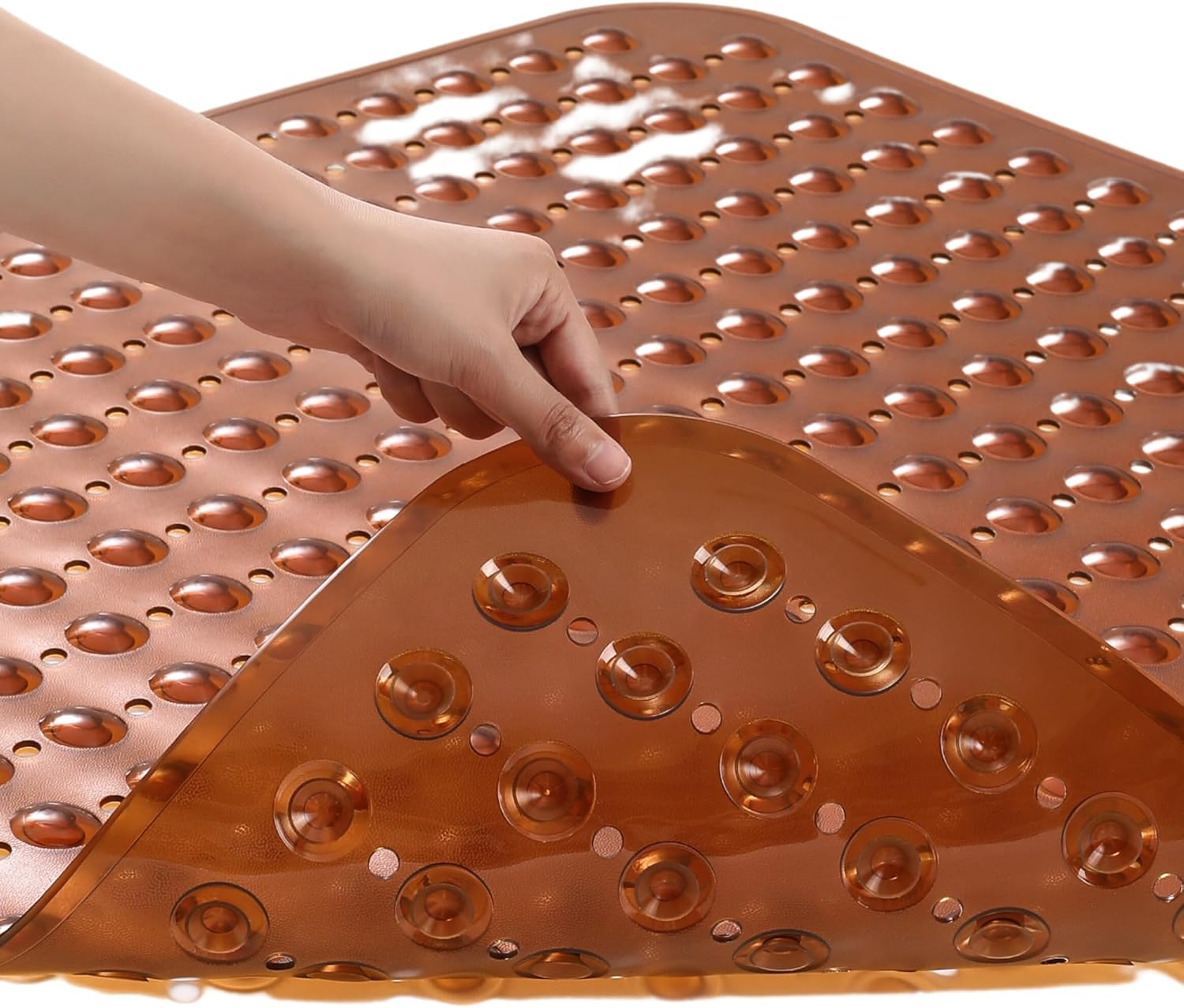 ENKOSI Extra Large Square Non Slip Shower Mat - 31 x 31-inch XL Bathroom Shower Mat - Square Shower Matts for Shower Stall Floors | Secure Suction Cups and Drain Holes (31x31 Clear Brown)