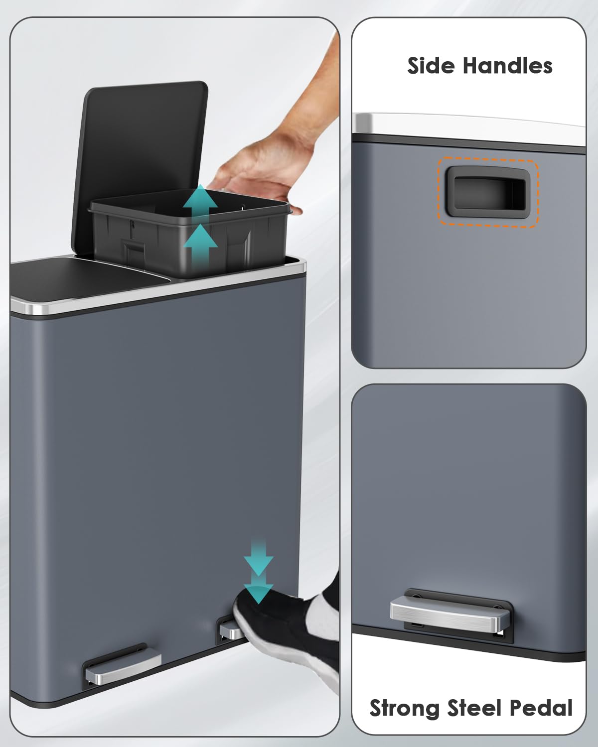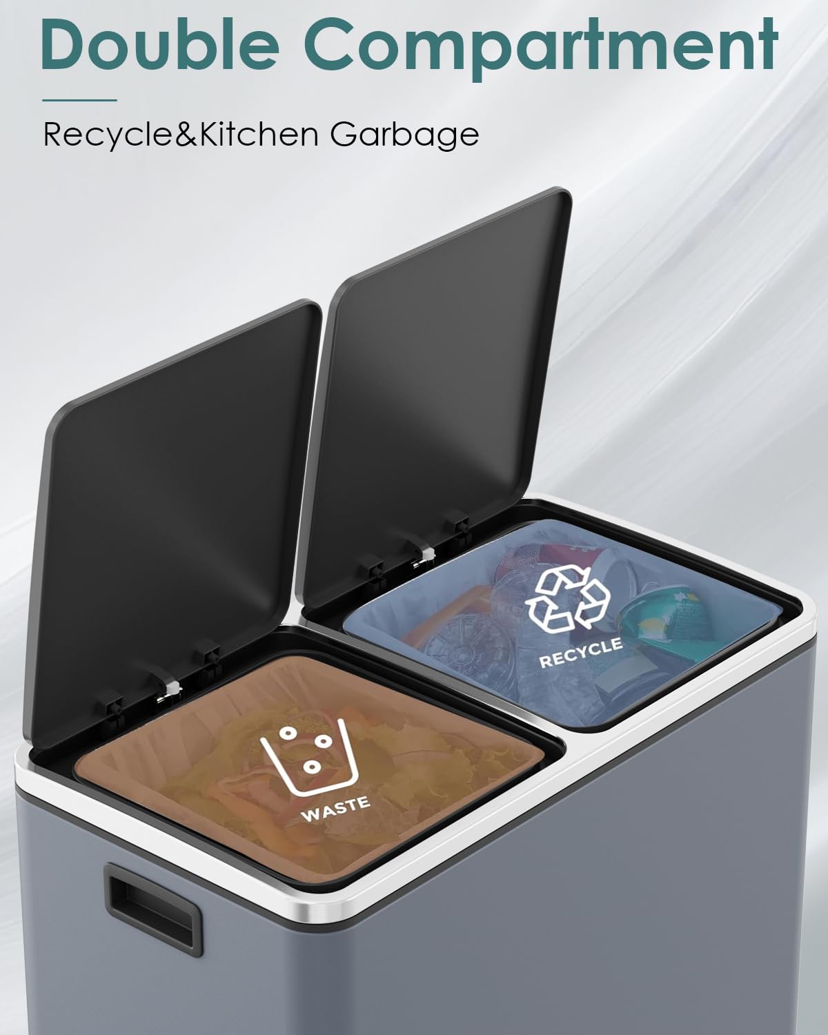 • 2*8 GALLONS COMPARTMENTS: Trash can has two independently compartments for trash and recyclables, making it easy to sort waste.