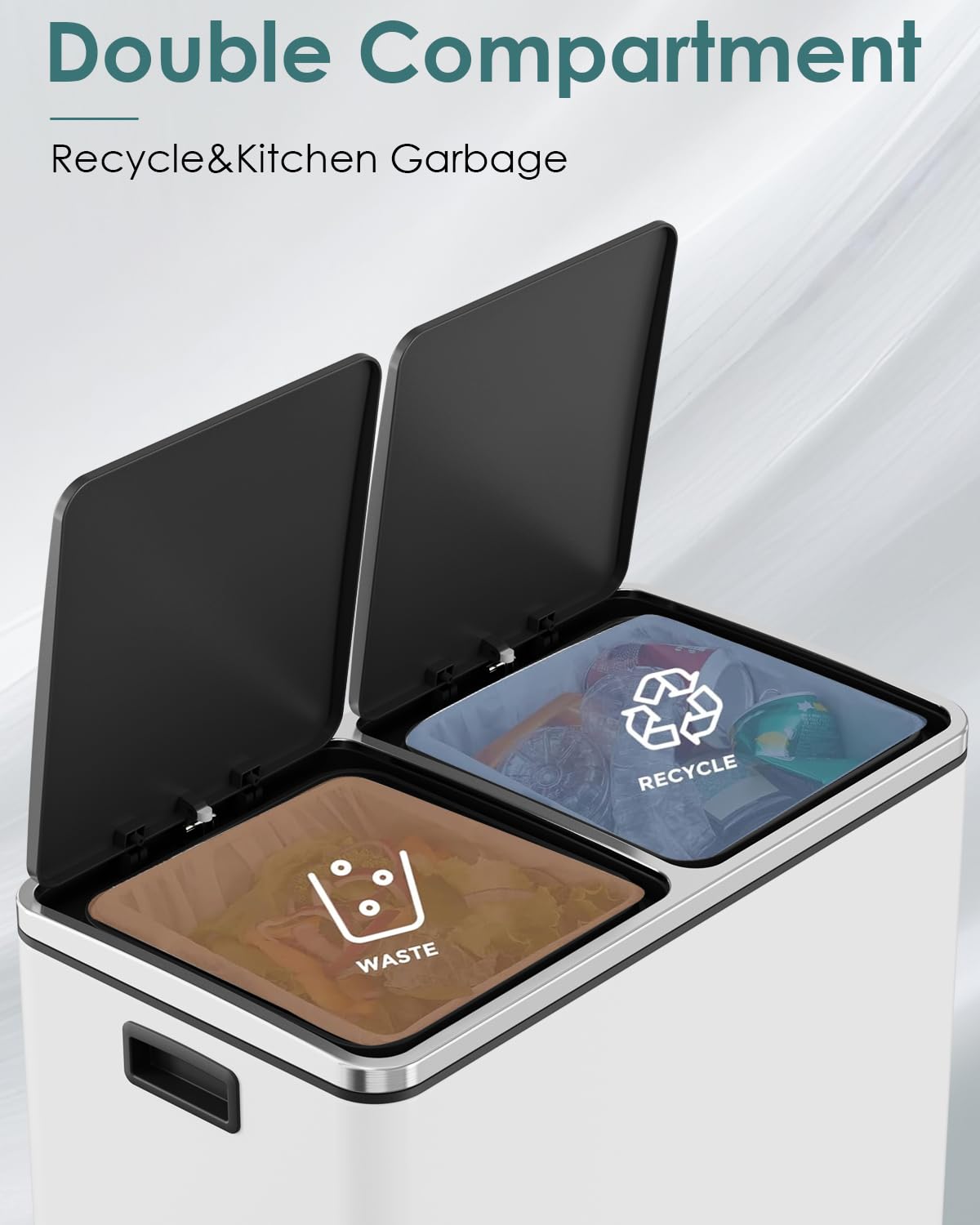 • 2*8 GALLONS COMPARTMENTS: Trash can has two independently compartments for trash and recyclables, making it easy to sort waste.