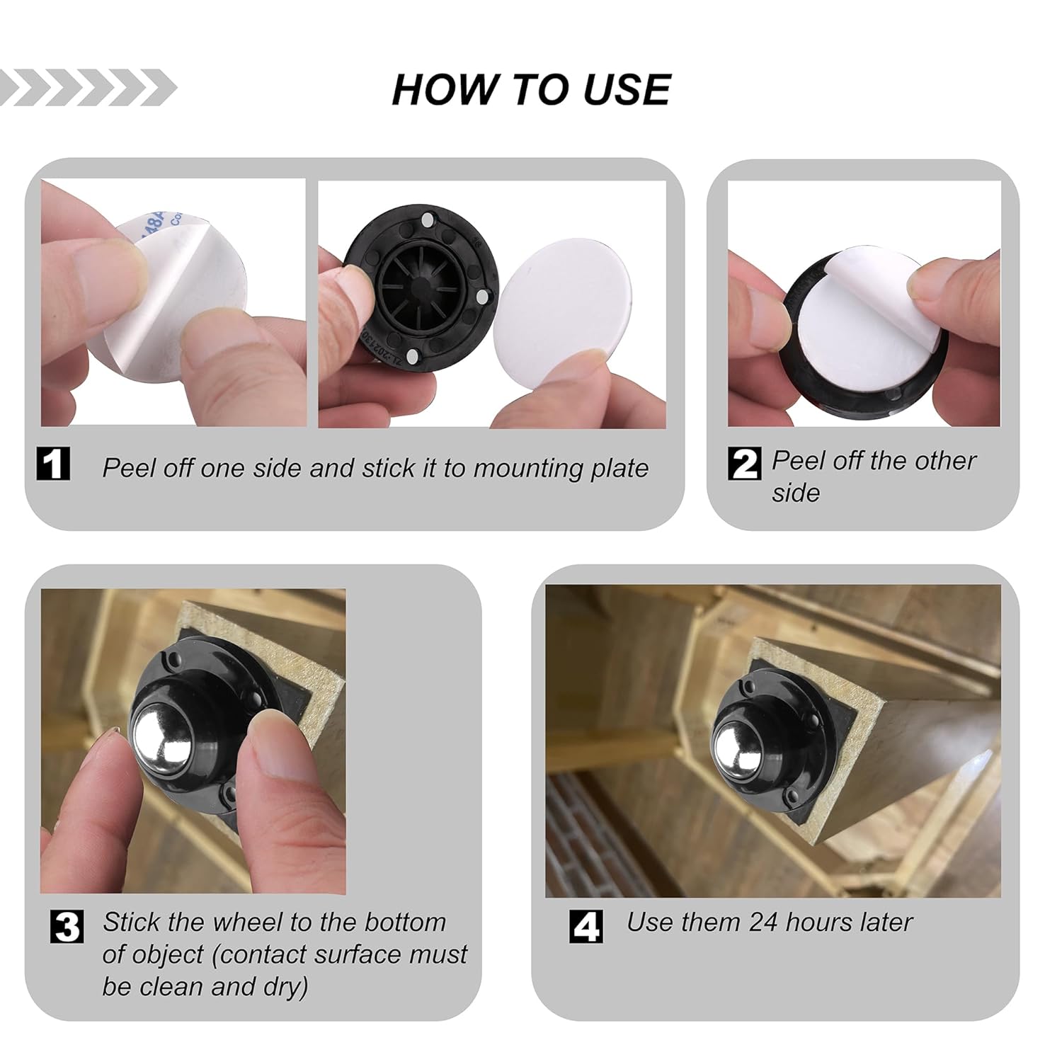 • 【Load Capacity】28 lbs each wheel. Total 110 lbs for 4 wheels, 220 lbs for 8 wheels, 330 lbs for 12 wheels. Wheel Size: Total height 24mm (1 inch) , mounting plate diamater 44mm (1-3/4 inch) , mounting hole diameter 4mm, distance between diagonal holes 36mm. Package Includes: Mini wheels x 12, adhesive pads x 12, screws x 48.