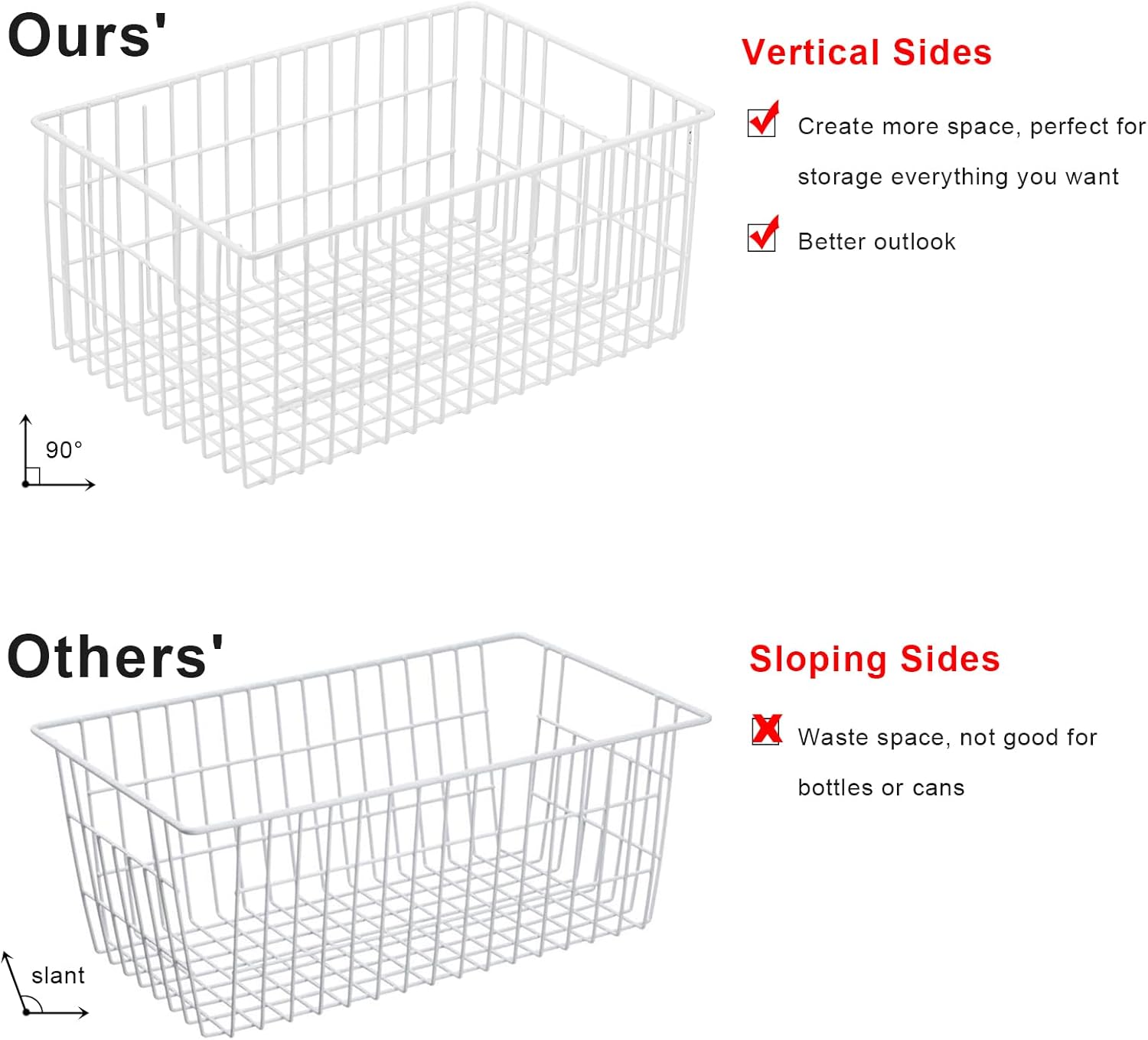 • Ideal Size For Various Items - For the most wire baskets in the market, bottom size is smaller than top size. Different from that, our wire baskets are standard cuboid structure which is better for space saving. Perfect for storing cans, bottles, cosmetic, snacks, drinks, fruits, vegetables, pantry items, toys, craft, office supplies and small appliances