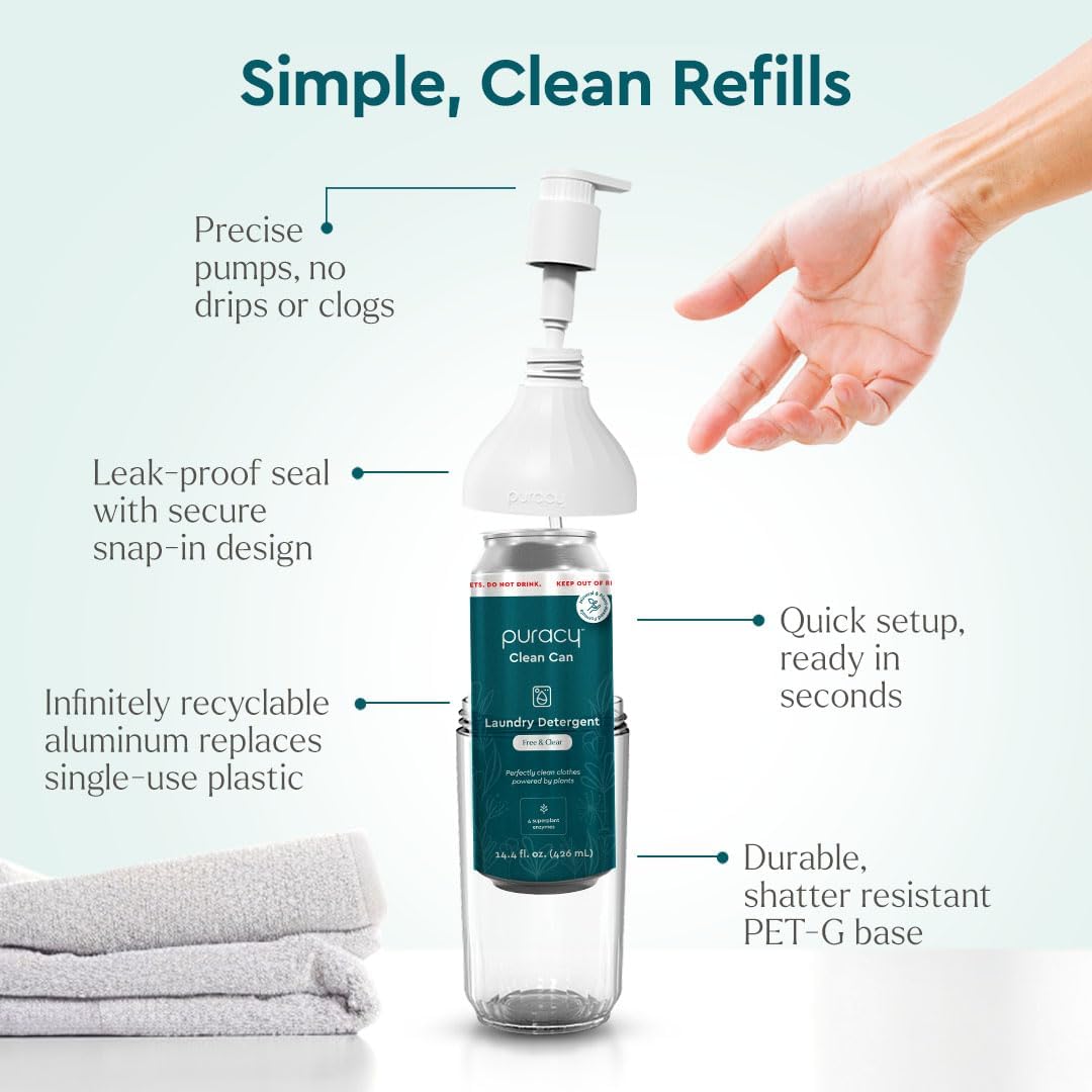 • Refill in Seconds - Clean Can systems allow you to refill your laundry detergent in a heartbeat. Open your can of Puracy liquid concentrate, attach the spray top, then secure. No mess, just ready-to-use laundry concentrate that keeps things simple.