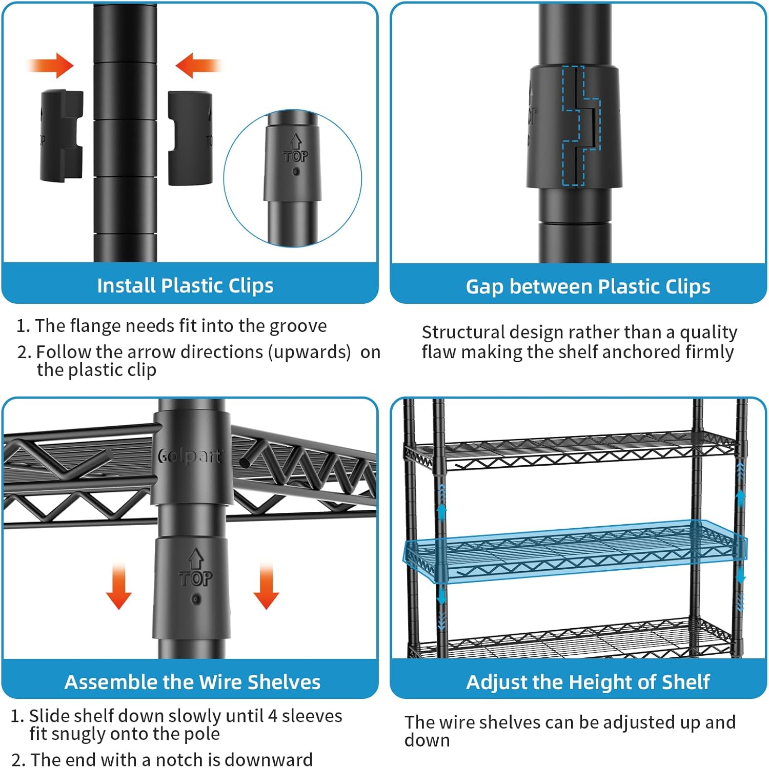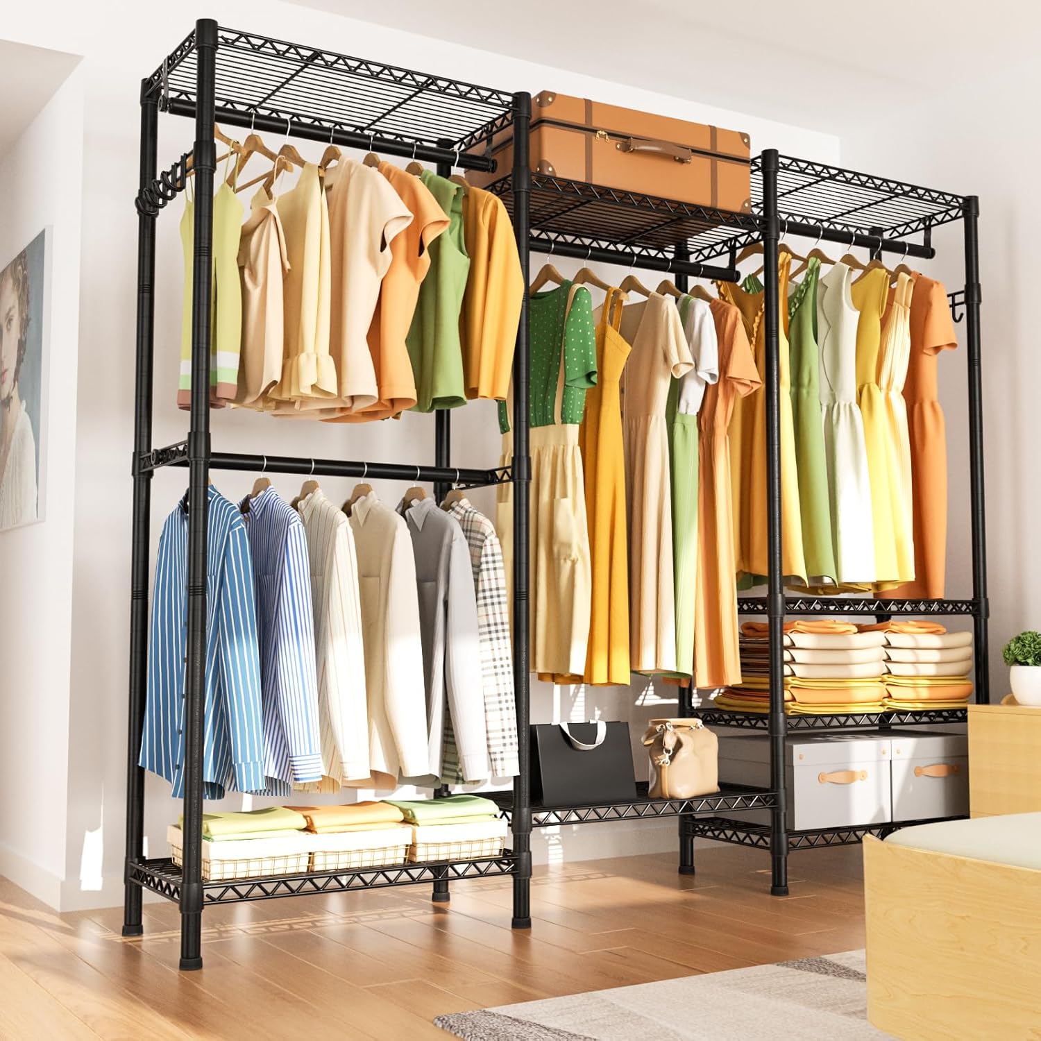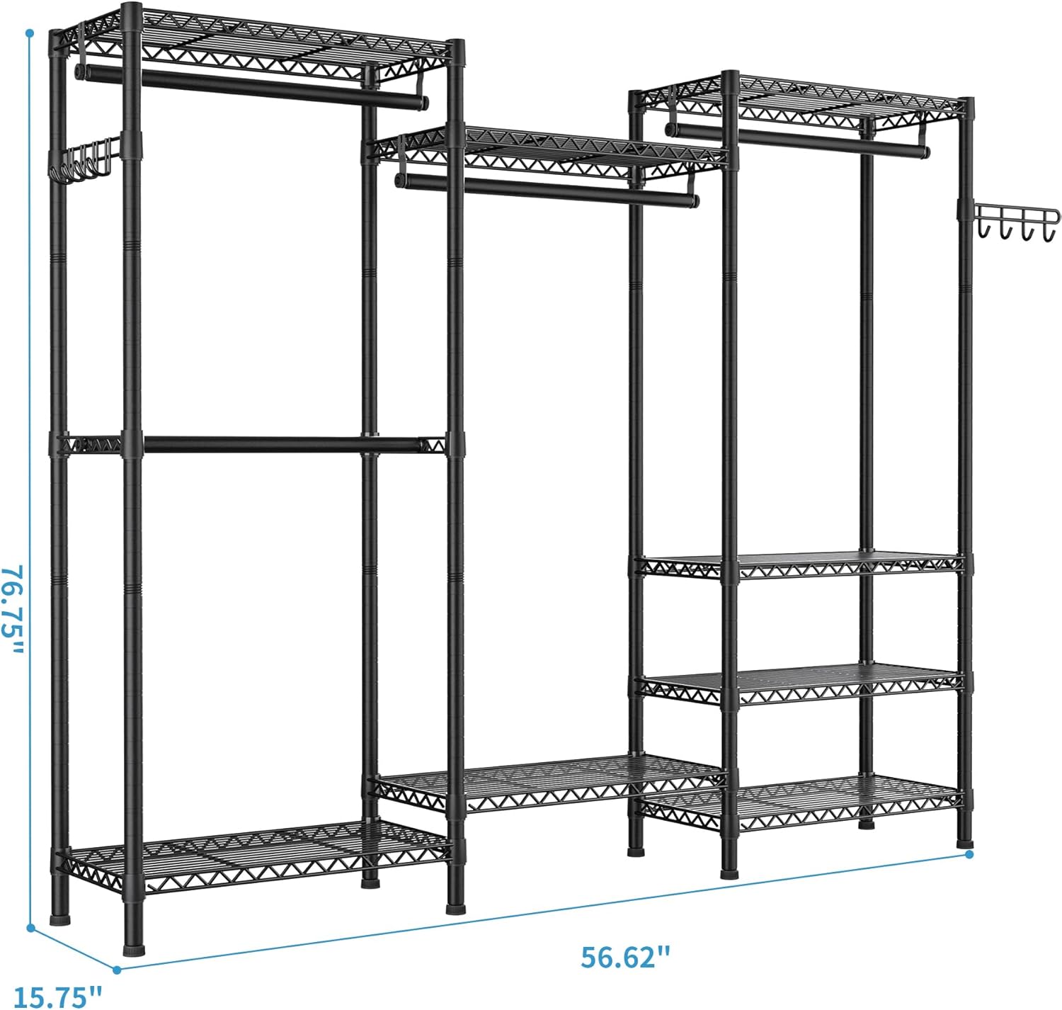 - Tailored Storage Solutions: Customize your storage space with 8 adjustable wire shelves and 4 hang rods,2 Hooks,offering unparalleled flexibility. Organize clothes, accessories, and more with precision and ease. This adaptable design ensures that your storage space evolves seamlessly with your changing needs