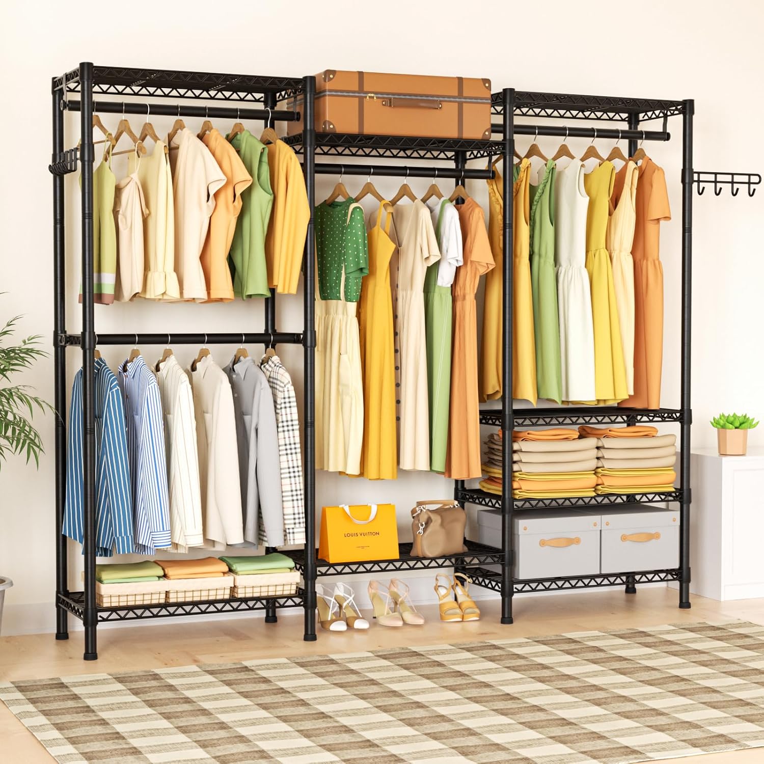 - Effortless Assembly & Dependable Design: Bid farewell to complex assembly processes. Our garment rack is designed for easy setup without the need for tools. The combination of user-friendly assembly and a large load capacity ensures a dependable storage solution that stands the test of time. Invest in a clothing storage system that effortlessly blends efficiency, durability, and style for an unparalleled storage experience