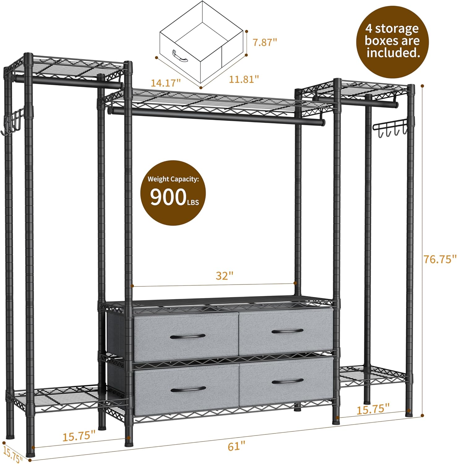 Large Garment Rack Heavy Duty Clothes Rack,Freestanding Closet Portable Clothing Rack with 8 Adjustable Wire Shelves,3 Hang Rods,4 Fabric Drawers,2 Hooks,Metal Closet Storage Wardrobe,MaxLoad 900lbs
