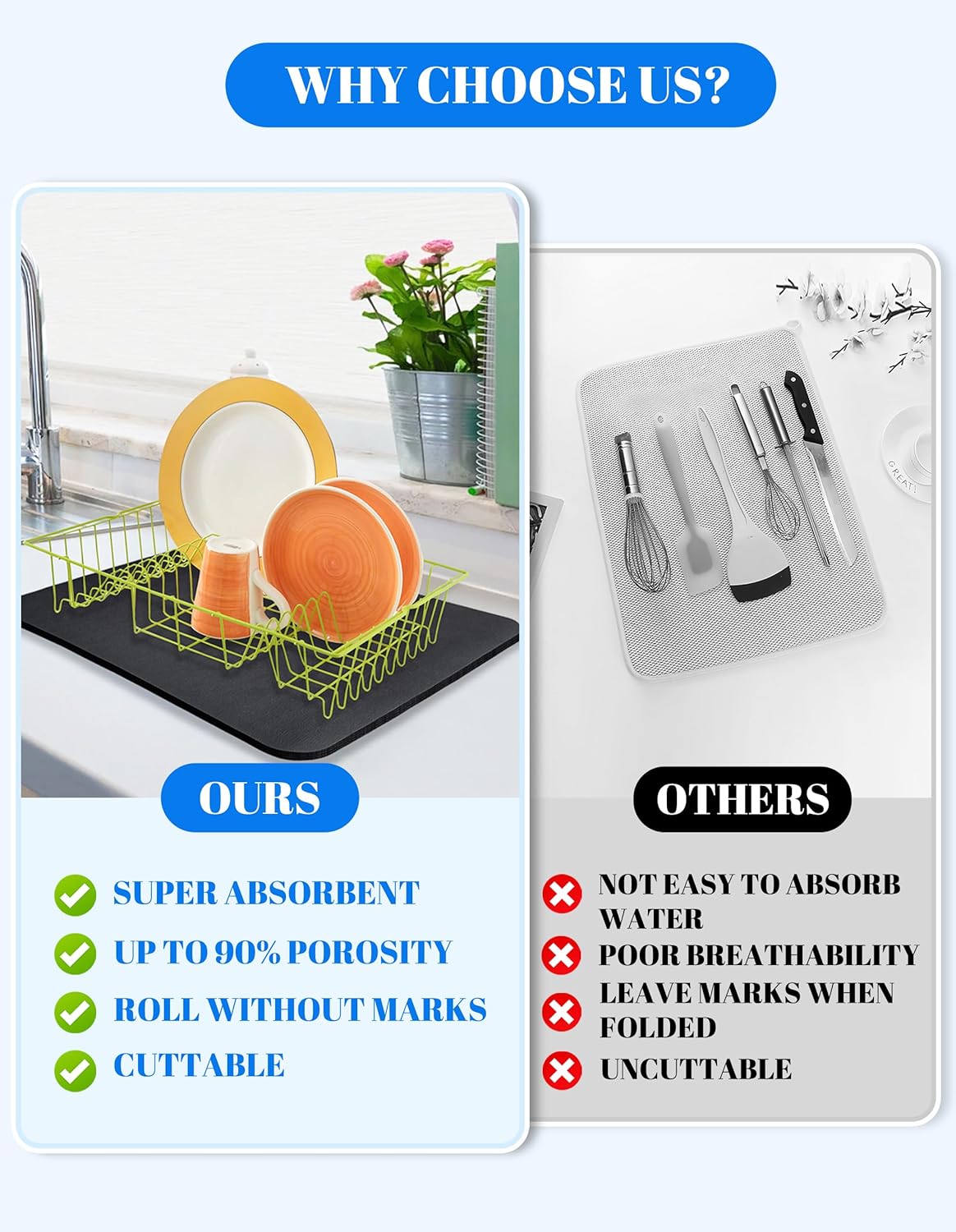 • SUPER ABSORBENT: The microfiber tableware dish drying mat is made of high-absorbent nanomaterials. Special PU surface hide coffee stains, milk stains and any other dark messy stains well. In addition, the drying mat is thick enough to better protect countertops, tableware, and glassware from damage and contamination.