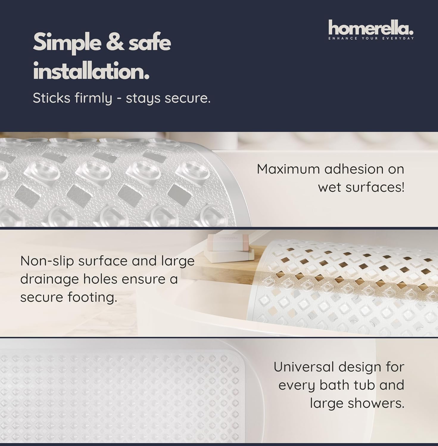 • Incl. 2 Hooks for Drying: Our Special Feature - No more wet anti slip bathtub mat on the edge of the bathtub! Thanks to the 2 self-adhesive hooks the anti slip shower mat can be dried and stored perfectly. They can be removed without leaving any residue.