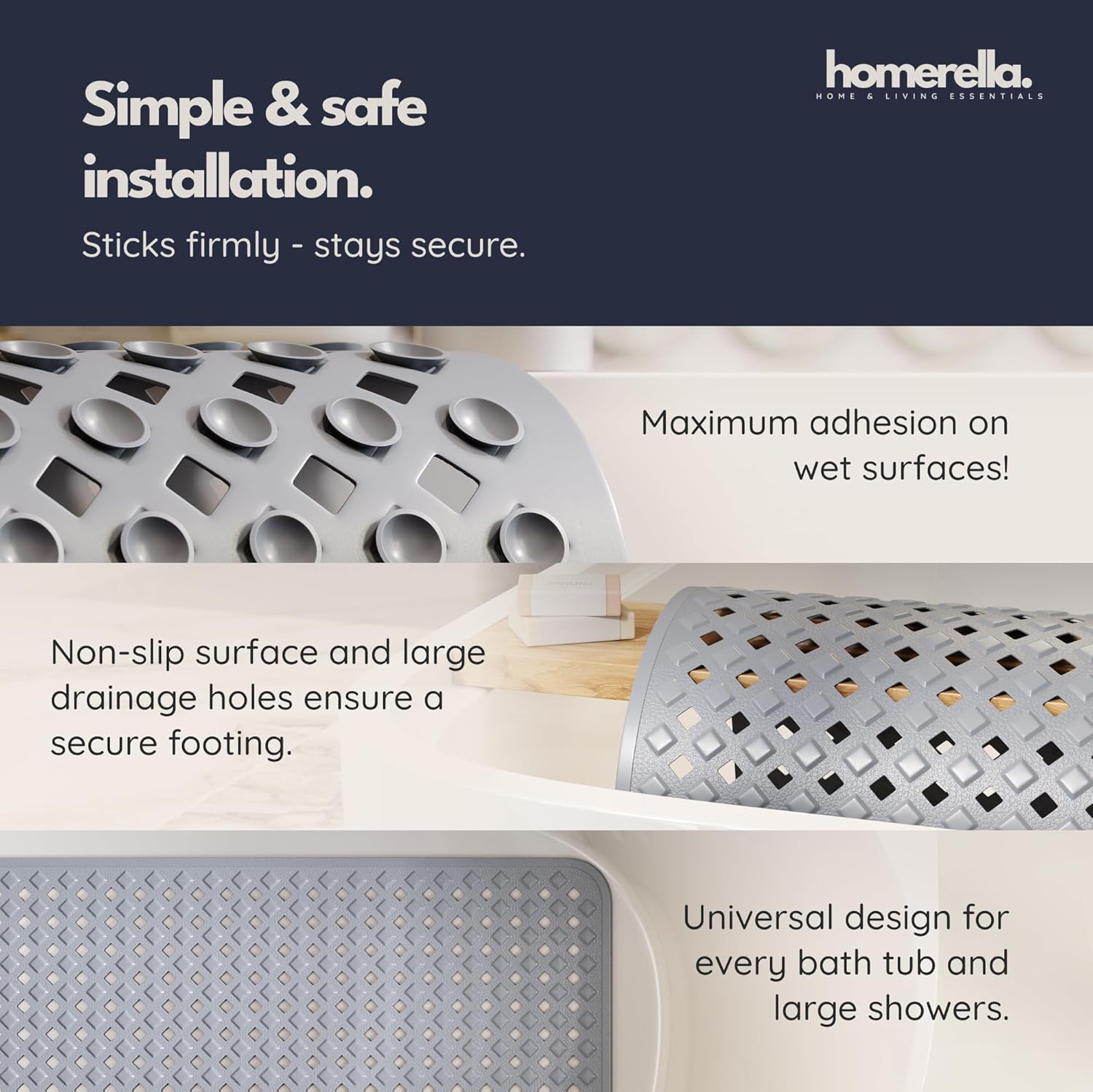 • Incl. 2 Hooks for Drying: Our Special Feature - No more wet anti slip bathtub mat on the edge of the bathtub! Thanks to the 2 self-adhesive hooks the anti slip shower mat can be dried and stored perfectly. They can be removed without leaving any residue.