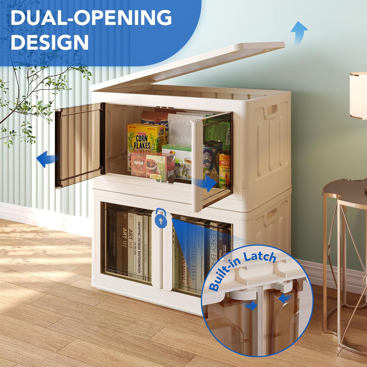- Dual-Opening Design: You can choose to open the top lid to access items or the front door for easier retrieval. The front door is also transparent, allowing for easy identification of storage contents. Plus, the front door is equipped with a built-in latch that can be locked and unlocked by simply turning the handle.