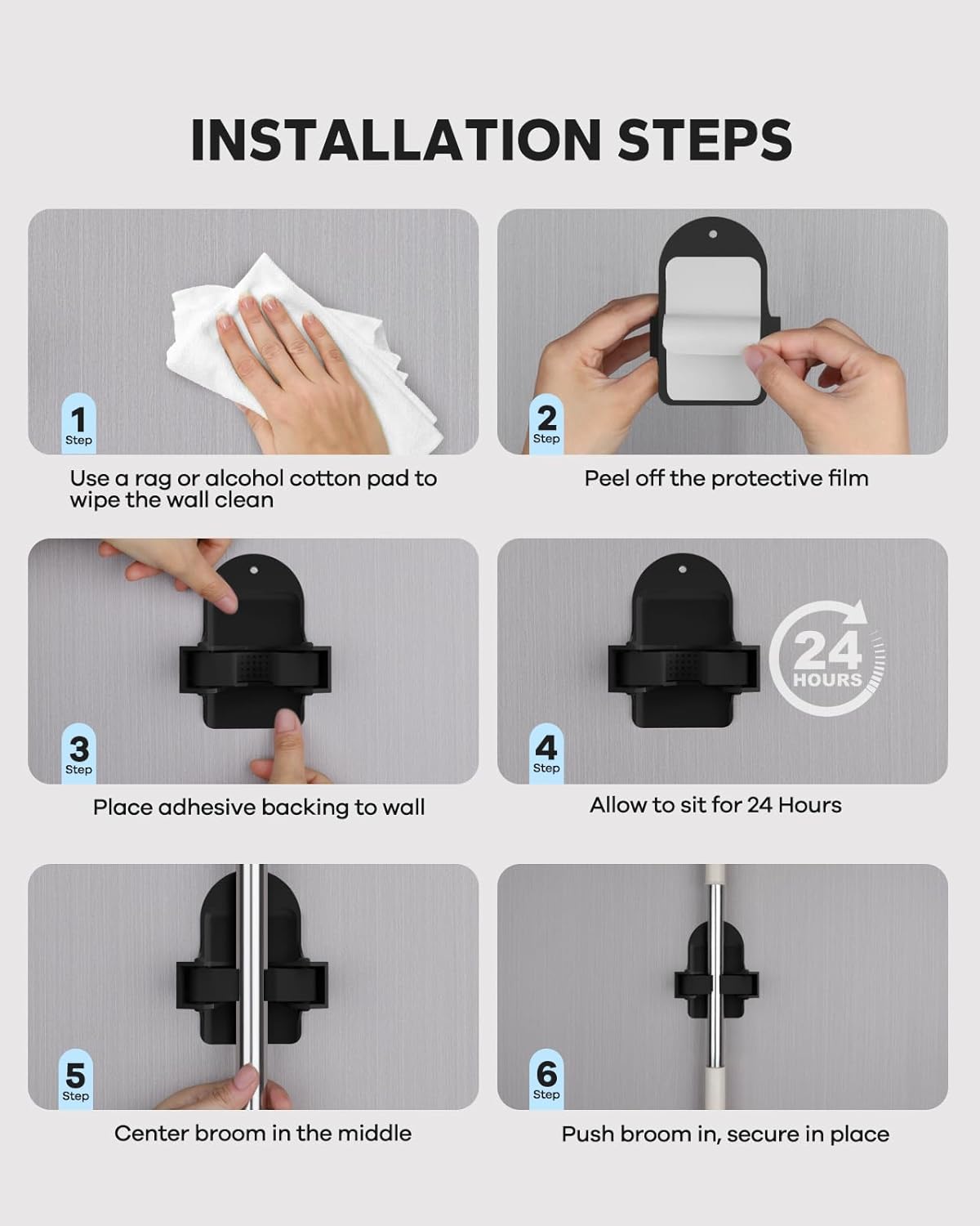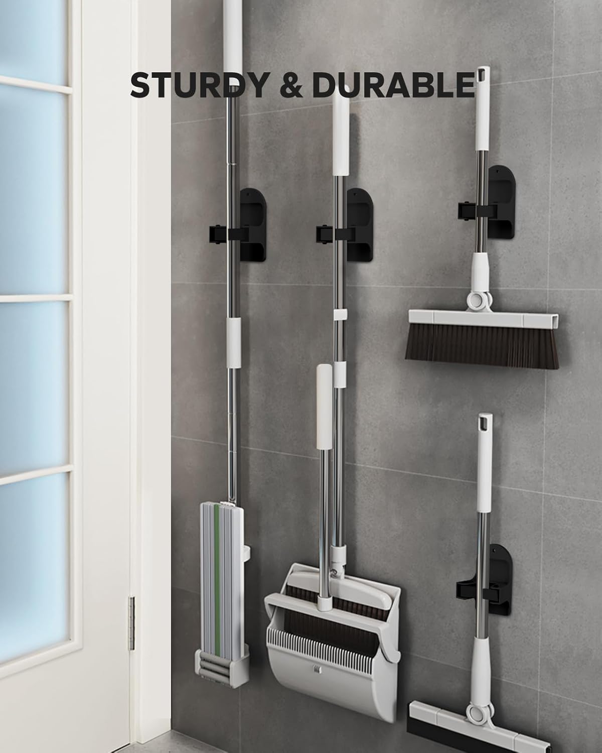 • Superb Stable - The Broom holder is made of metal base board, Stainless steel grip, and metal Hooks. It is strong, durable, and waterproof.