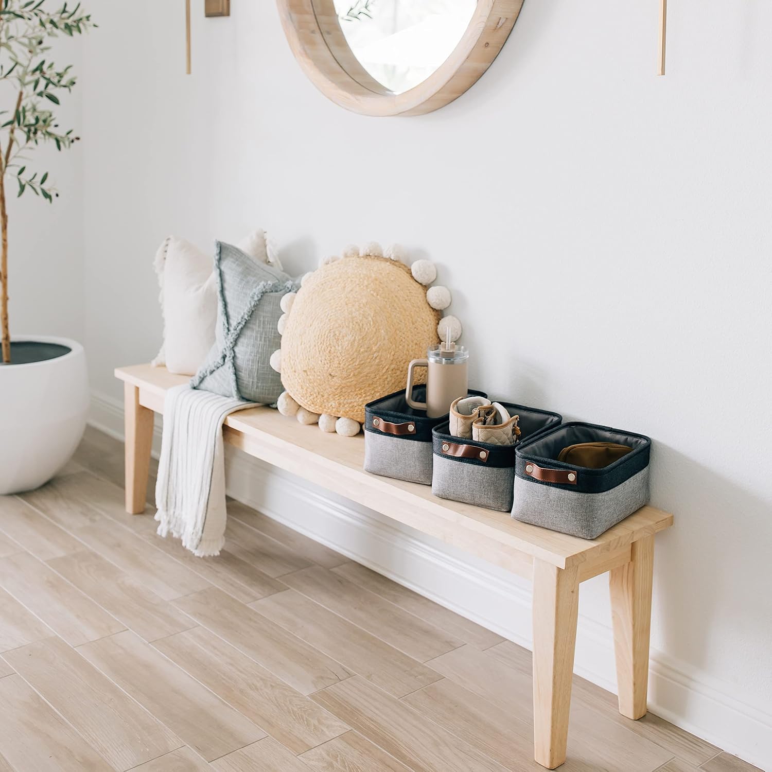 • Decorative Fabric and Vegan Leather – These versatile storage baskets for organizing your everyday life are made with a thick, high-quality fabric and fitted with leather handles to add a stylish touch to a living room, bedroom, office, or personal space.
