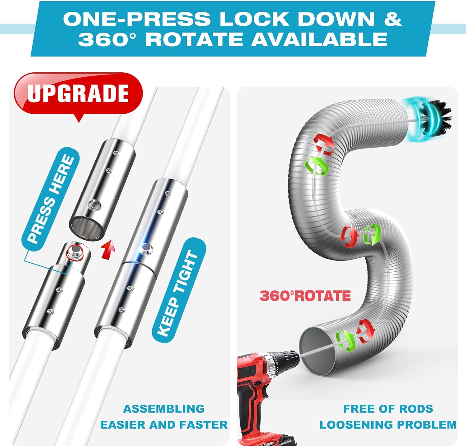 • 【EASY TO INSTALL AND USE】- The quick snap rods are upgraded to assemble faster and NO need to concern rods coming apart whether turning clockwise or counterclockwise. The dryer vent cleaning equipment with auger brush works well with cordless drill, enable to finish dryer cleaning thoroughly and omnidirectional