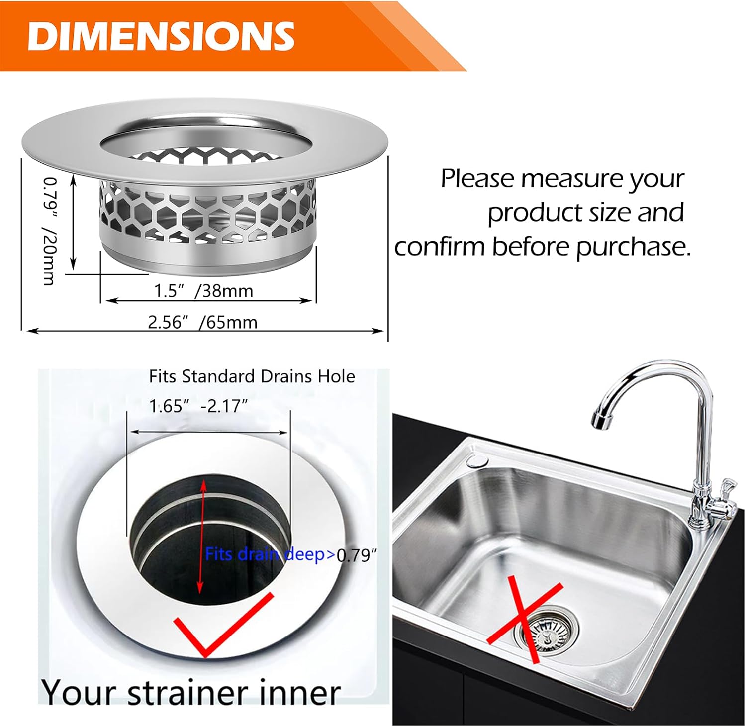 • PERFECT SIZE: Outer Diameter 2.56 inch/65mm, Inner Diameter 1.5inch/38mm, Depth 0.79 inch/20mm. this strainer is great for 1.65" -2.17"drain. PLEASE CAREFULLY CHECK THE DIAMETER OF YOUR DRAIN SIZE BEFORE YOU PURCHASE.