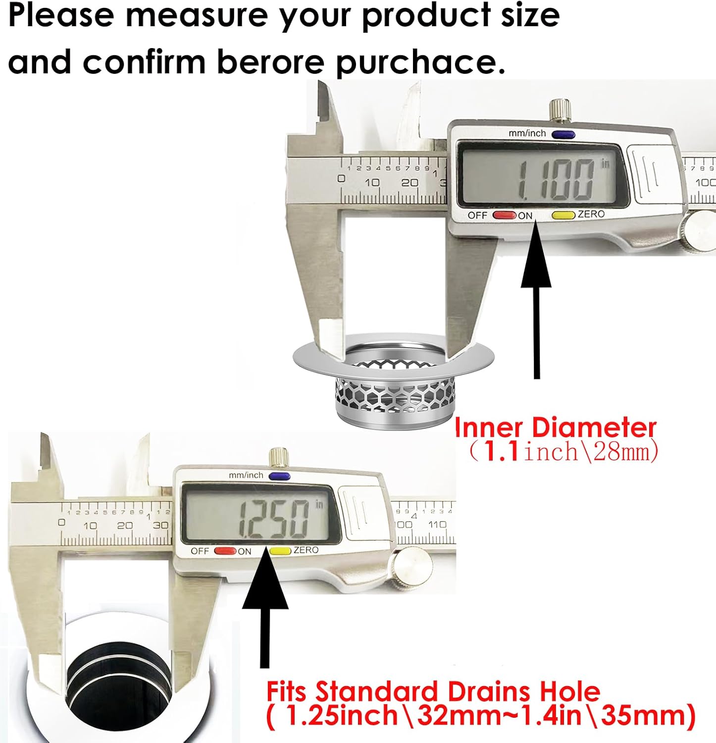 • PERFECT SIZE: Outer Diameter 1.97 inch/50mm, Inner Diameter 1.1inch/28mm, Depth 0.67 inch/17mm. this strainer is great for 1.25" drain. PLEASE CAREFULLY CHECK THE DIAMETER OF YOUR DRAIN SIZE BEFORE YOU PURCHASE.