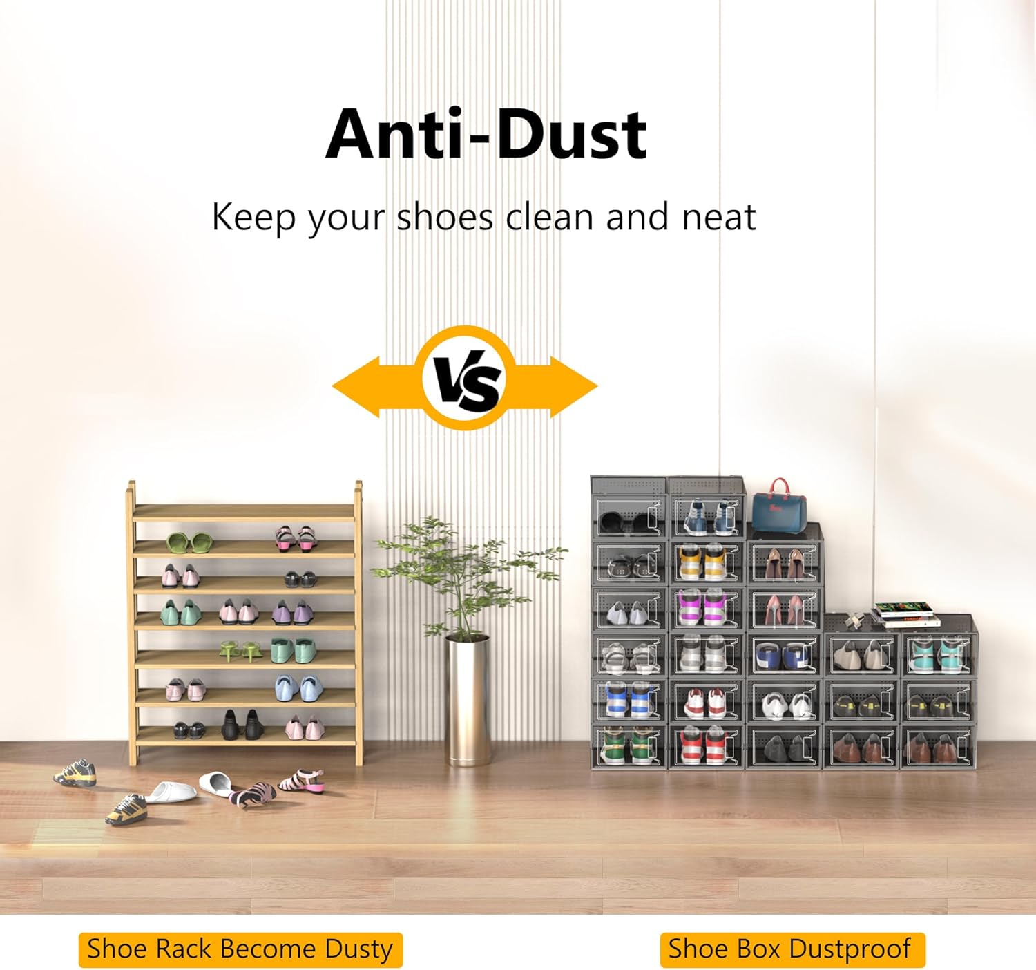 • Alternatives to Traditional Shoe Racks: Compared with traditional shoe rack, shoe storage box with lid is dust-free and stackable. Modular design make combine them according to available space conveniently, easy to move and use.