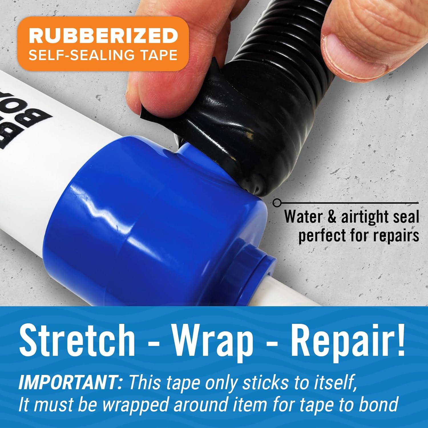 • ULTRA STRONG HOLD: Stretch the tape while wrapping the item. After two minutes, the plumbing tape for sealing forms a permanent bond. Our black self bonding leak stop tape also works great as waterproof automotive tape and irrigation repair tape.