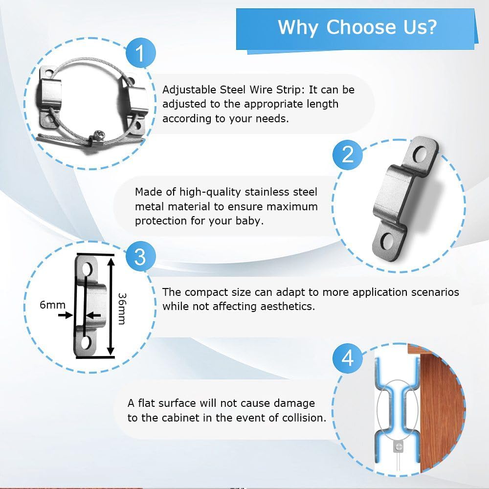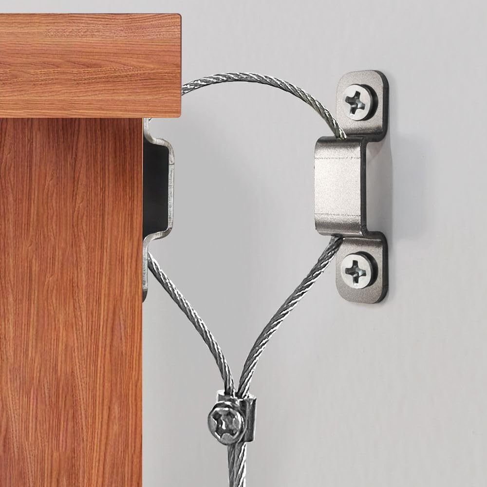 • Unlike other products on the market who directly use fixed length steel wire keychains, our steel wire rope adopts an adjustable design, allowing your cabinet to be tightly fixed without tilting