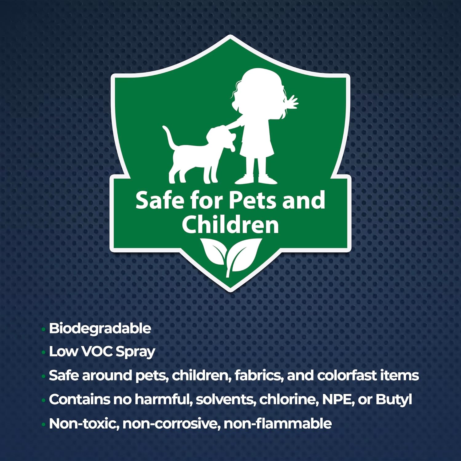 • SAFE AND BIODEGRADABLE: This biodegradable, low VOC spray is safe around pets and children, contains no harmful chemicals, solvents, chlorine, NPE, fragrances, dyes, or butyl, is non-toxic, non-corrosive, non-flammable, and requires no PPE