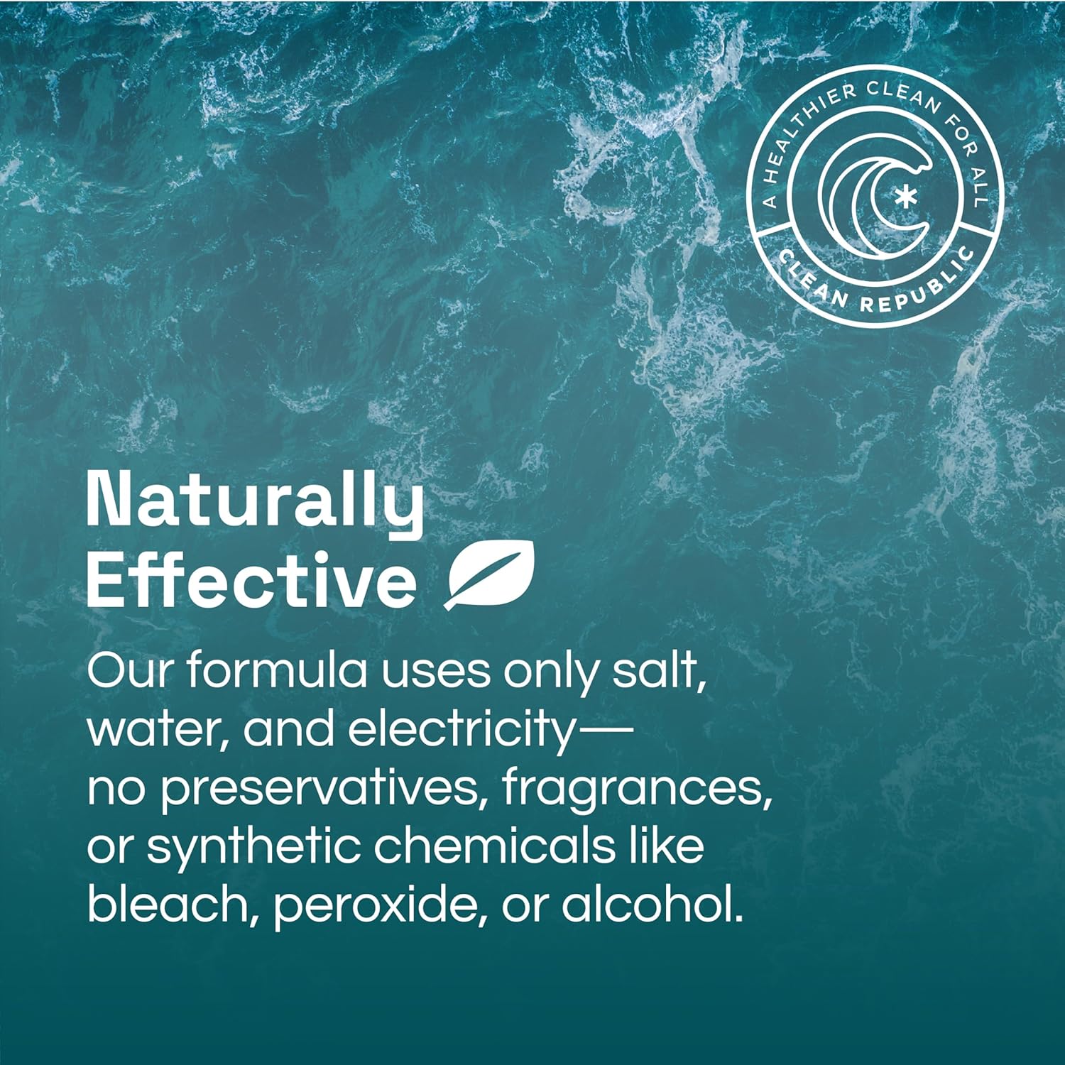 • Pure and Simple: Our natural formula is made with just salt, water, and electricity, with no preservatives, fragrances, or synthetic chemicals like bleach, peroxide, or alcohol. It is non-corrosive, eliminates odors, and freshens the air