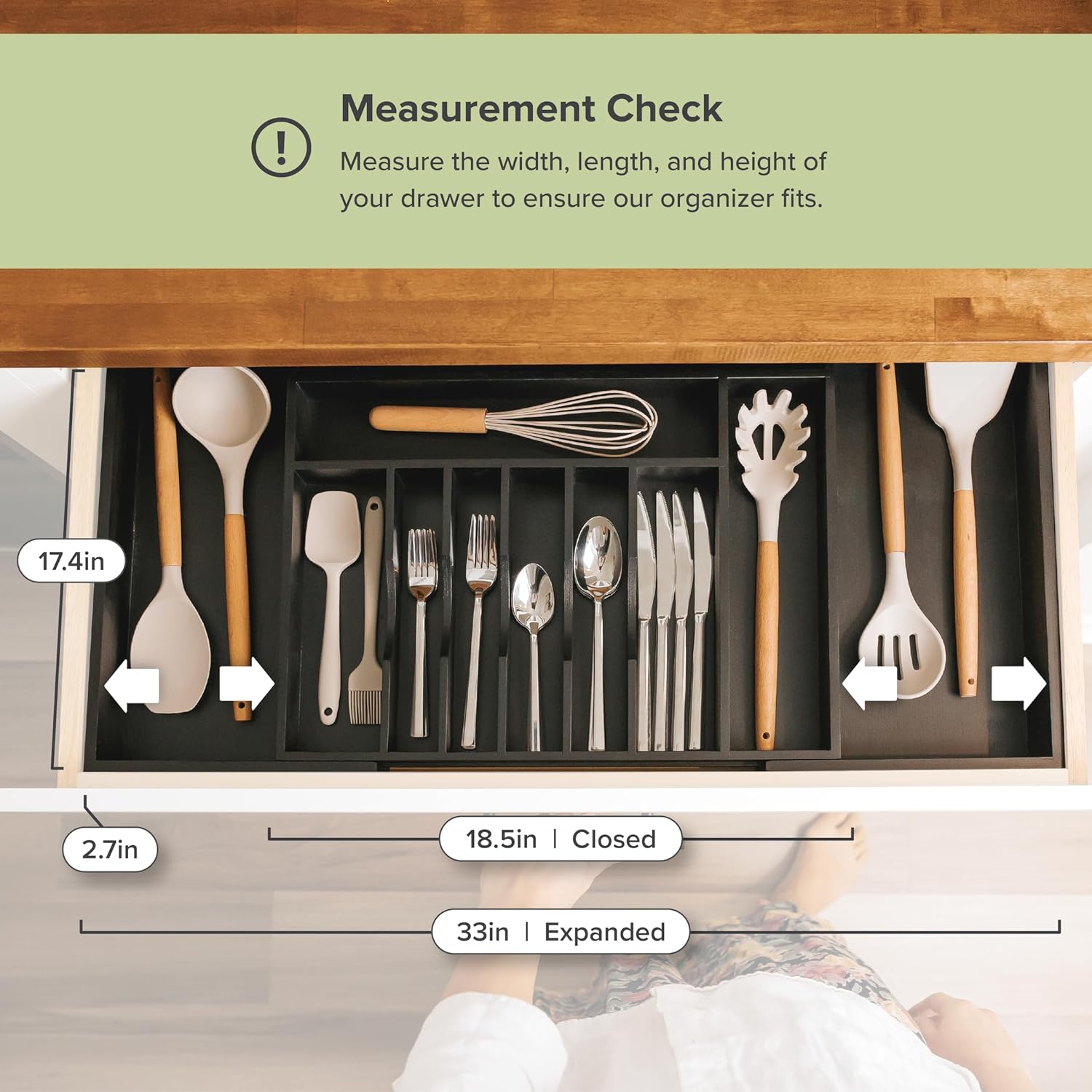 - MAXIMIZE YOUR DRAWER’S STORAGE CAPACITY: This 11-compartment (9 fixed + 2 adjustable) organizer measures 17.4” long x 2.7” tall and expands from 18.5” to 33” wide (and any width in between). Most other flatware organizers expand to 22” or 23” wide and are only 2” tall. It’s amazing how much storage capacity an extra 0.7” in height adds when filling your organizer full of flatware and utensils!