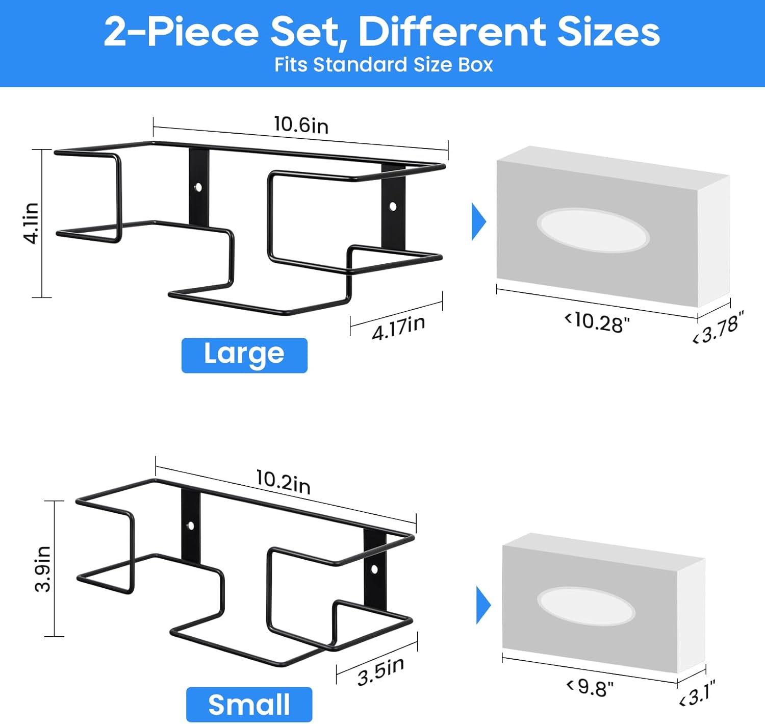 • 【What’ s Included】large holder x 1, small holder x 1, adhesive pad x 2, screw and anchor x 4. A set of two glove holders fits standard size glove boxes. The large one can hold boxes measuring 10.28"L*3.78"W or smaller, and the small one can hold 9.8"L*3.1"W or smaller.
