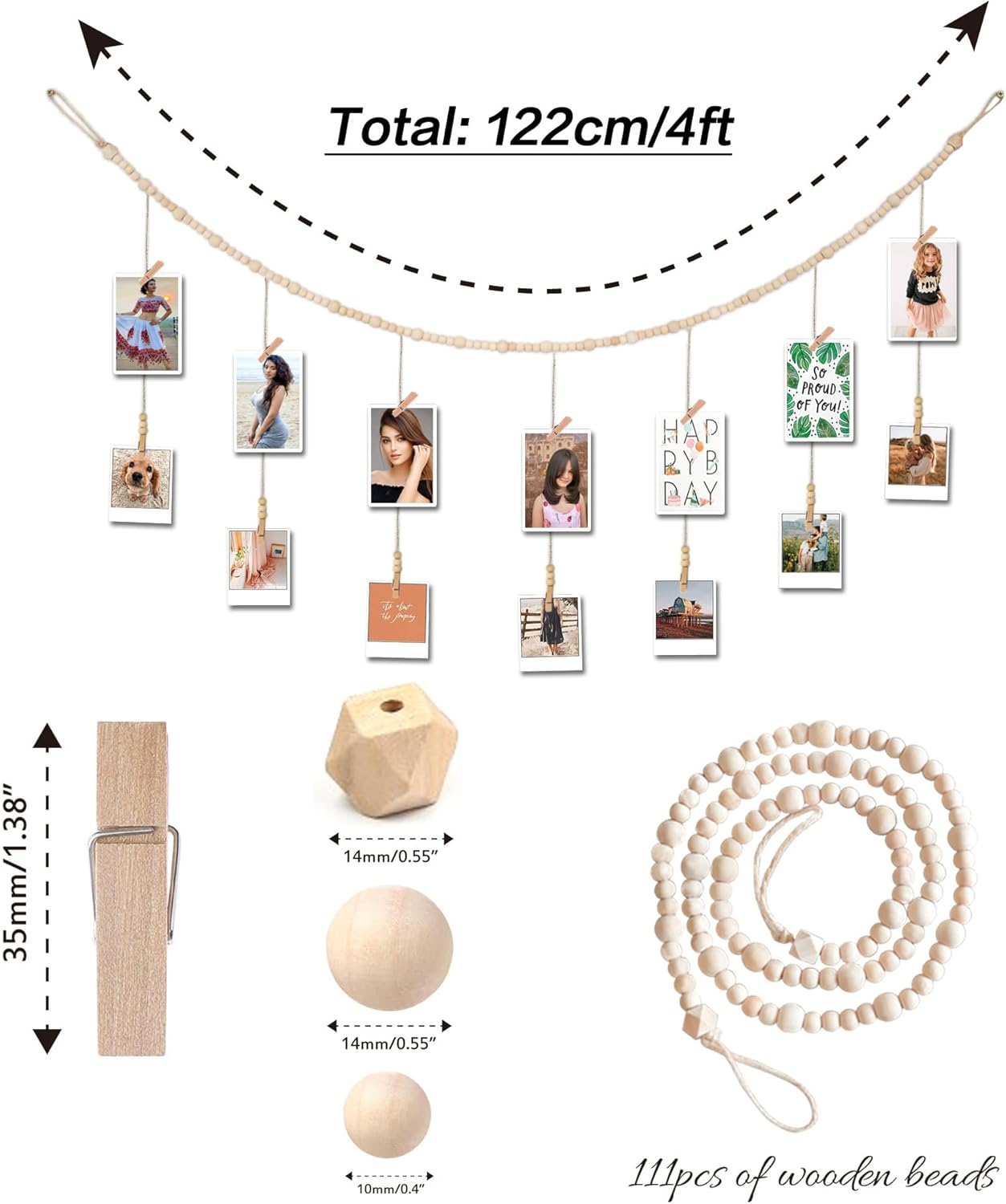 • THE POSSIBILITIES ENDLESS: This beautiful natural wood bead garland with clothespin is perfect for displaying family photos, kids artwork, polaroid photos, homeschool activities, holiday and Christmas cards...