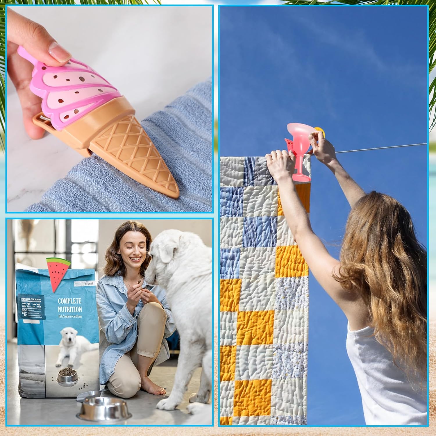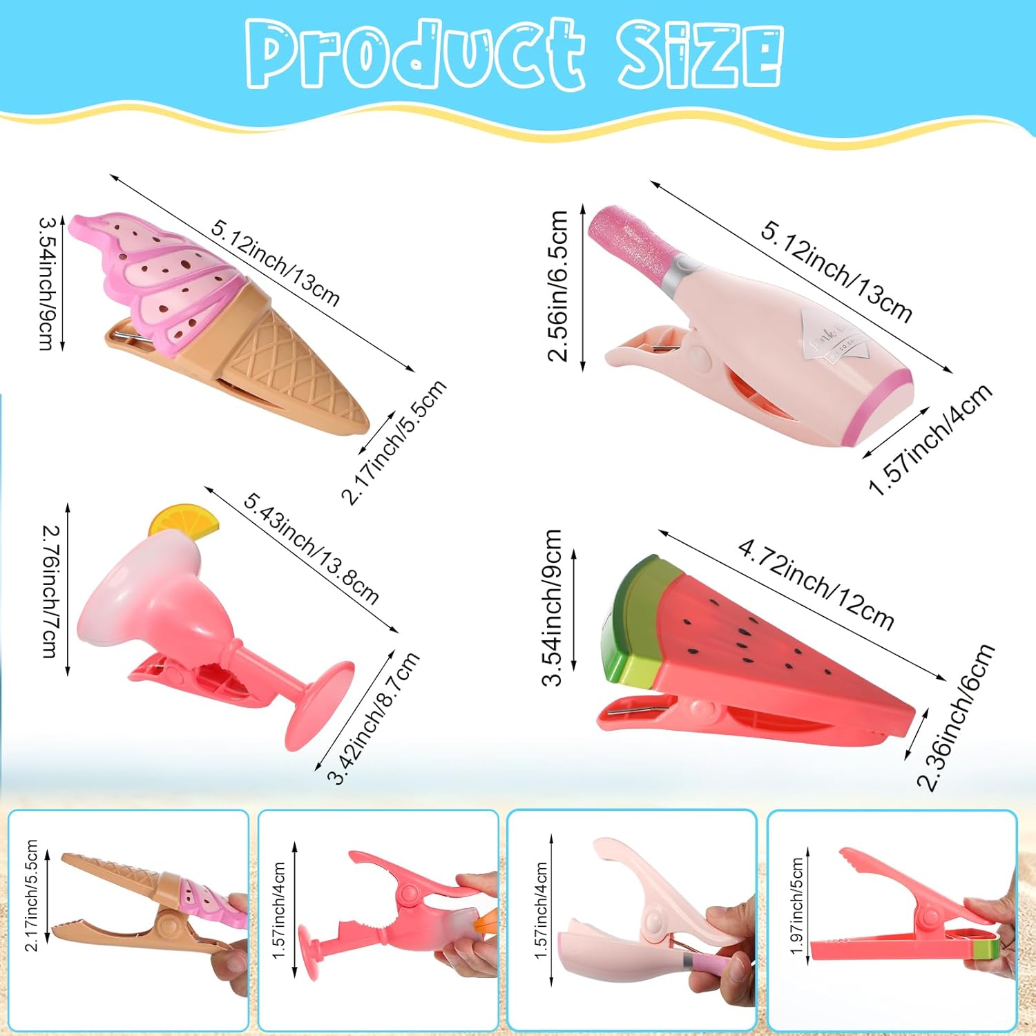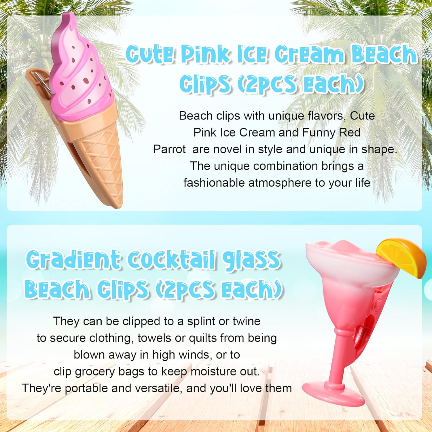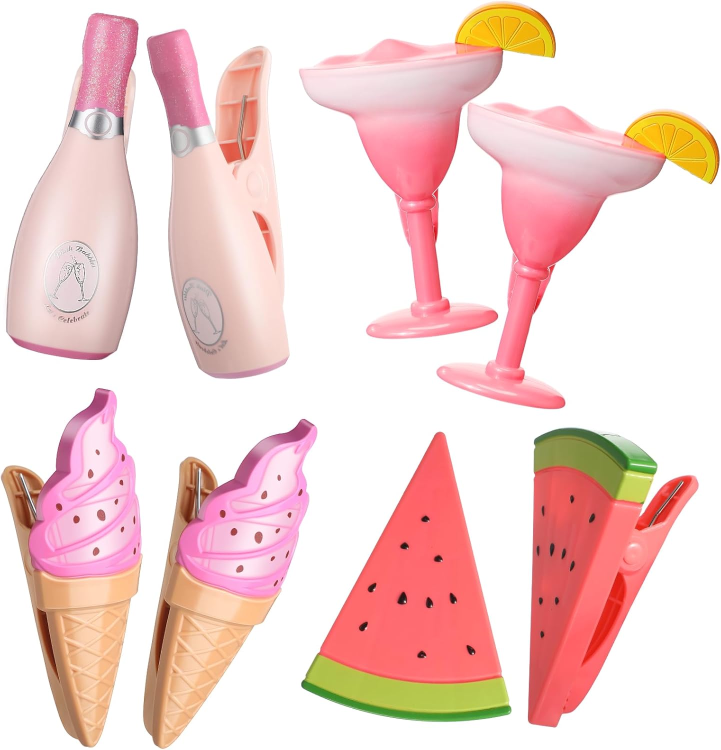 • Cute and Funny: the decorative beach towel clips adopt champagne glass, gradient margarita glass, ice cream, and watermelon styles, look cute and funny, you can use them to clip clothing, towels, and bedding