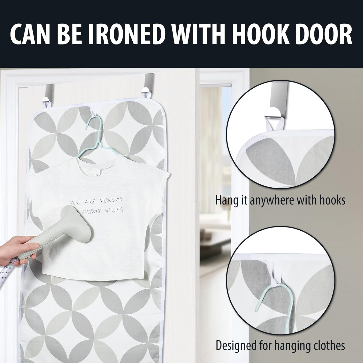 • HANGING IRONING DESIGN: There has three hanging holes on this mat, two for hanging on the door or other places. The middle one is for hanging clothes. Can be used as a over the door ironing board. You are not limited on the table top for ironing. This item is good partner for steam iron. Two hooks are included
