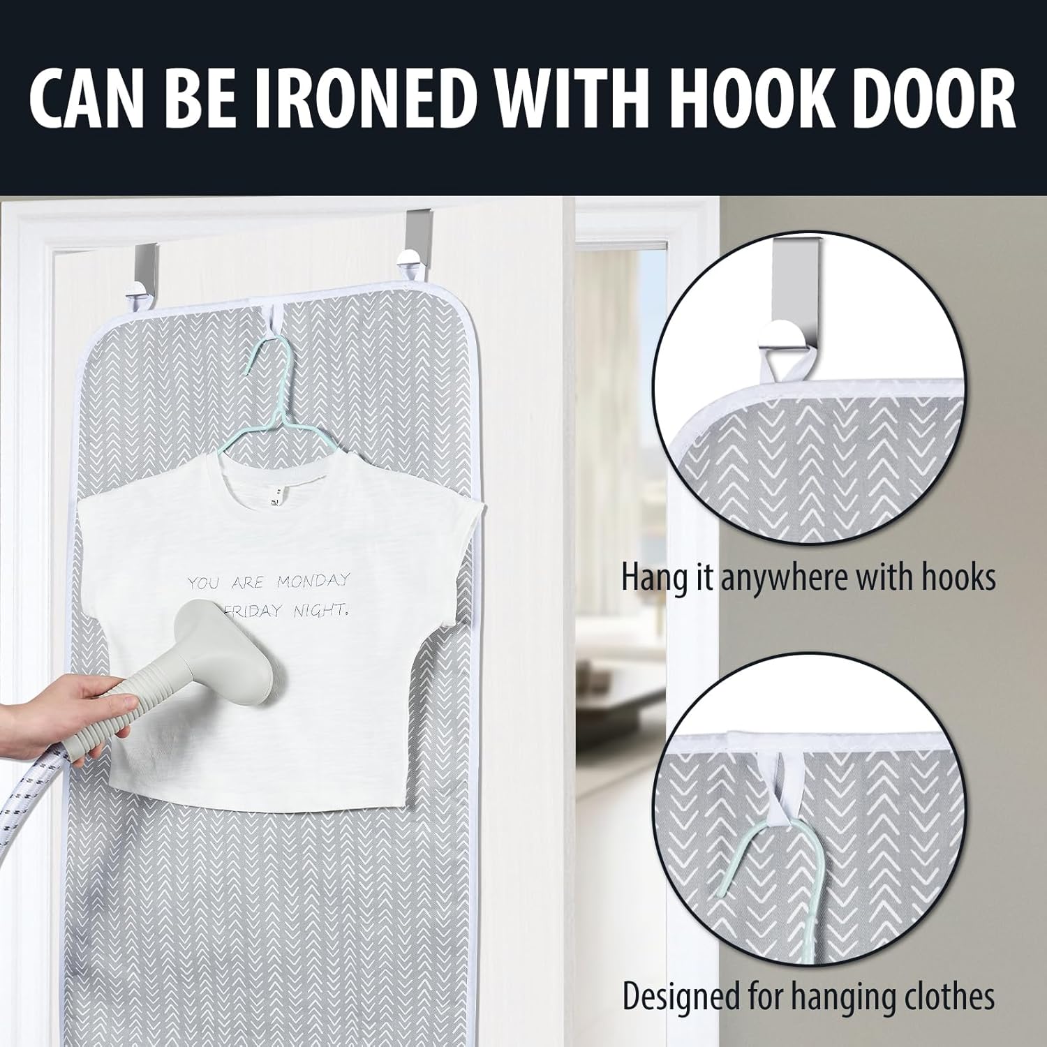 • HANGING IRONING DESIGN: There has three hanging holes on this mat, two for hanging on the door or other places. The middle one is for hanging clothes. Can be used as a over the door ironing board. You are not limited on the table top for ironing. This item is good partner for steam iron. Two hooks are included