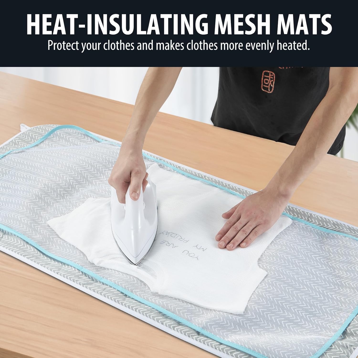 • INSULATION PROTECTIVE MESH: This table top ironing mat comes with a heat insulating and breathable net, meticulous and uniform mesh density makes clothes more evenly heated during ironing, effectively protects your clothes, especially dark clothes and expensive clothes