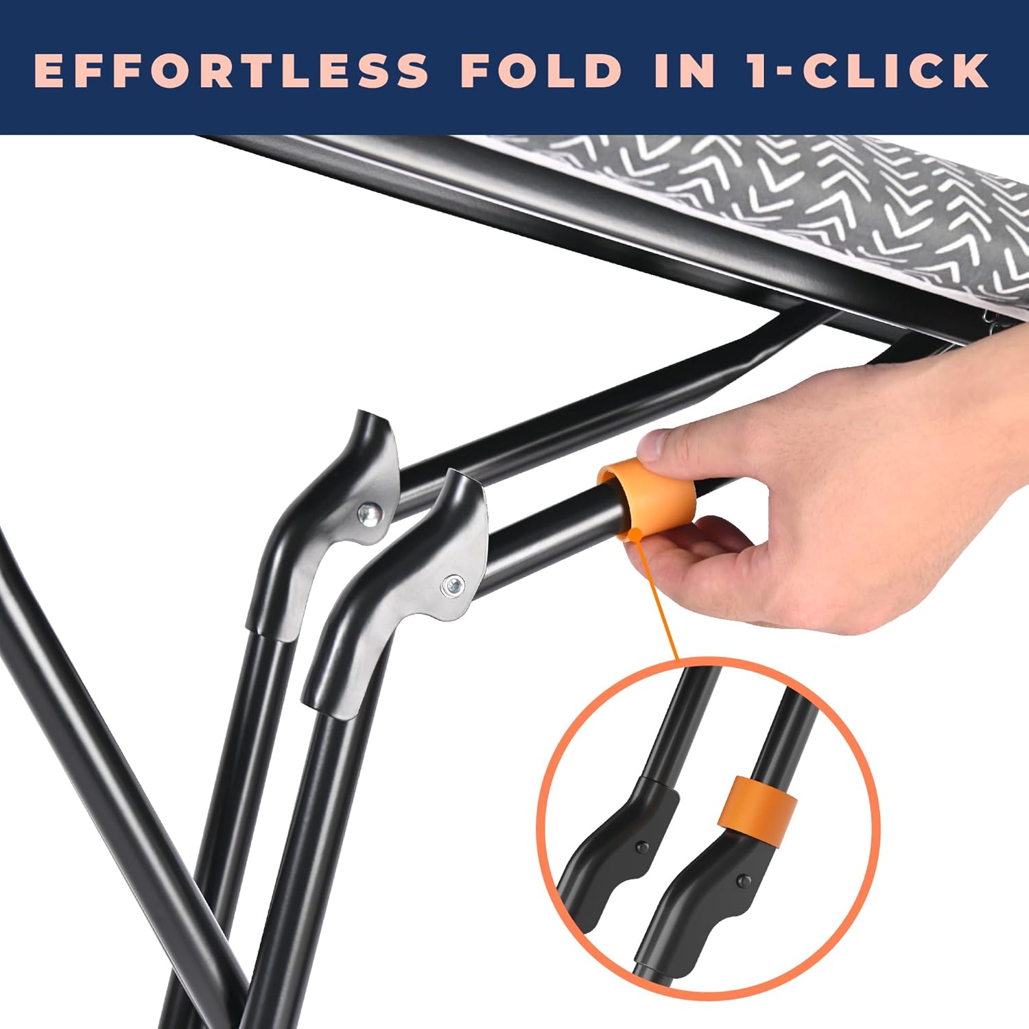 • EASY FOLDING Effortless One-Click Folding: Fold the ironing board effortlessly with just one click—no bending or heavy lifting required. Transforms into a compact hanger for quick and hassle-free storage.