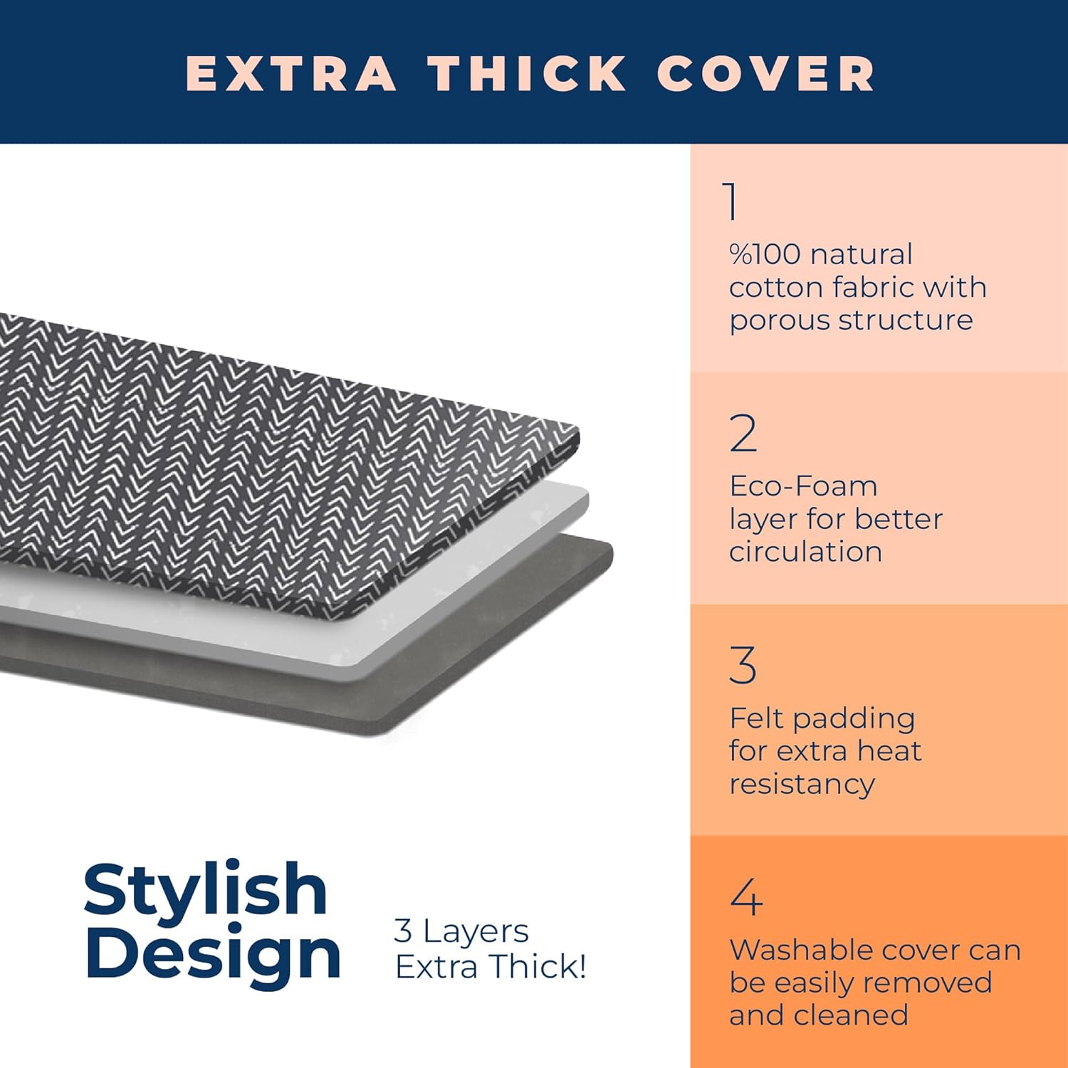 • EXTRA THICK 4-LAYER BOARD COVER PAD Ultimate Durability Smooth Ironing: 4-layer ironinh board cover with a blend of foam, felt, and fabric ensures smooth ironing without sticking The extra thick 100% cotton Heat-resistant surface keeps clothes safe.