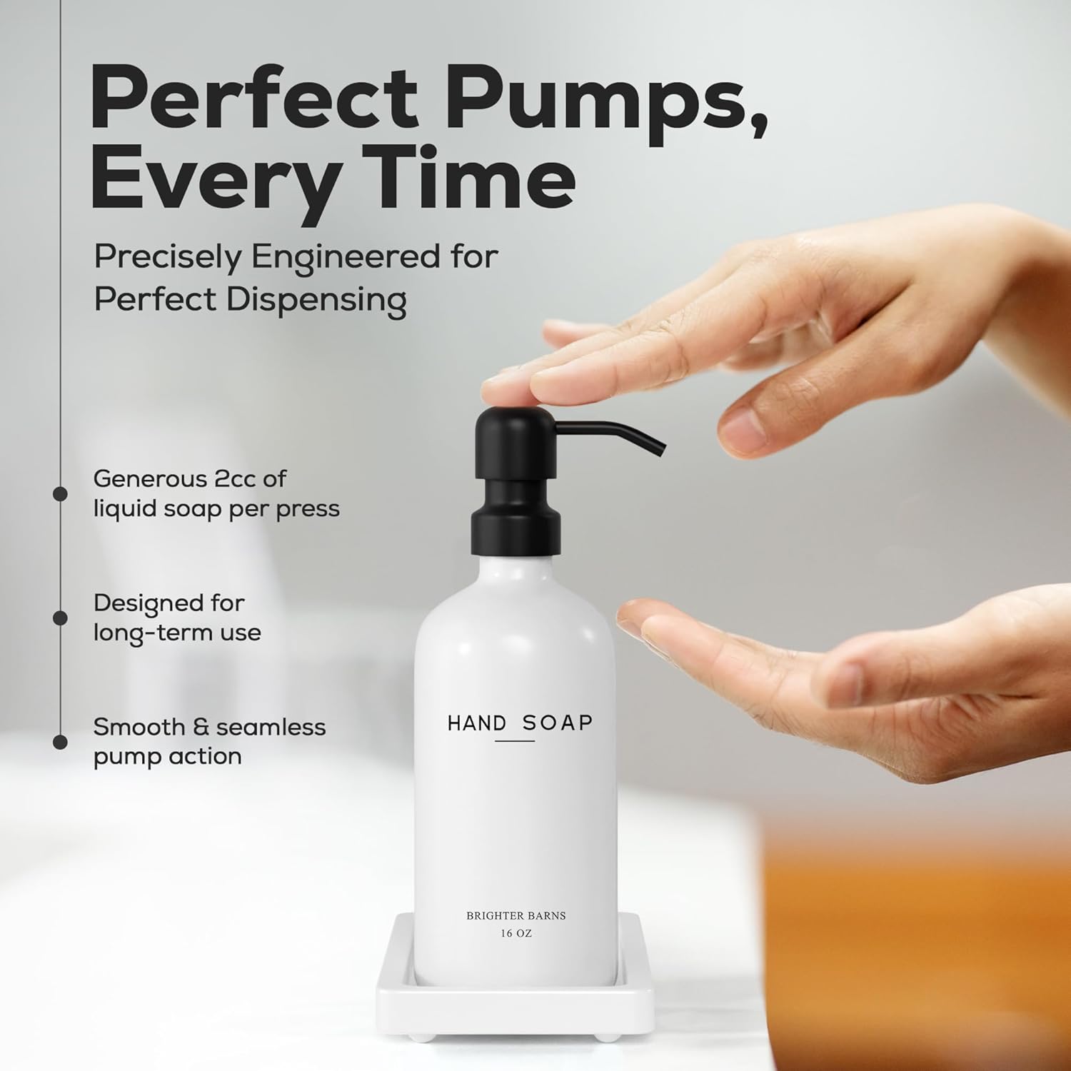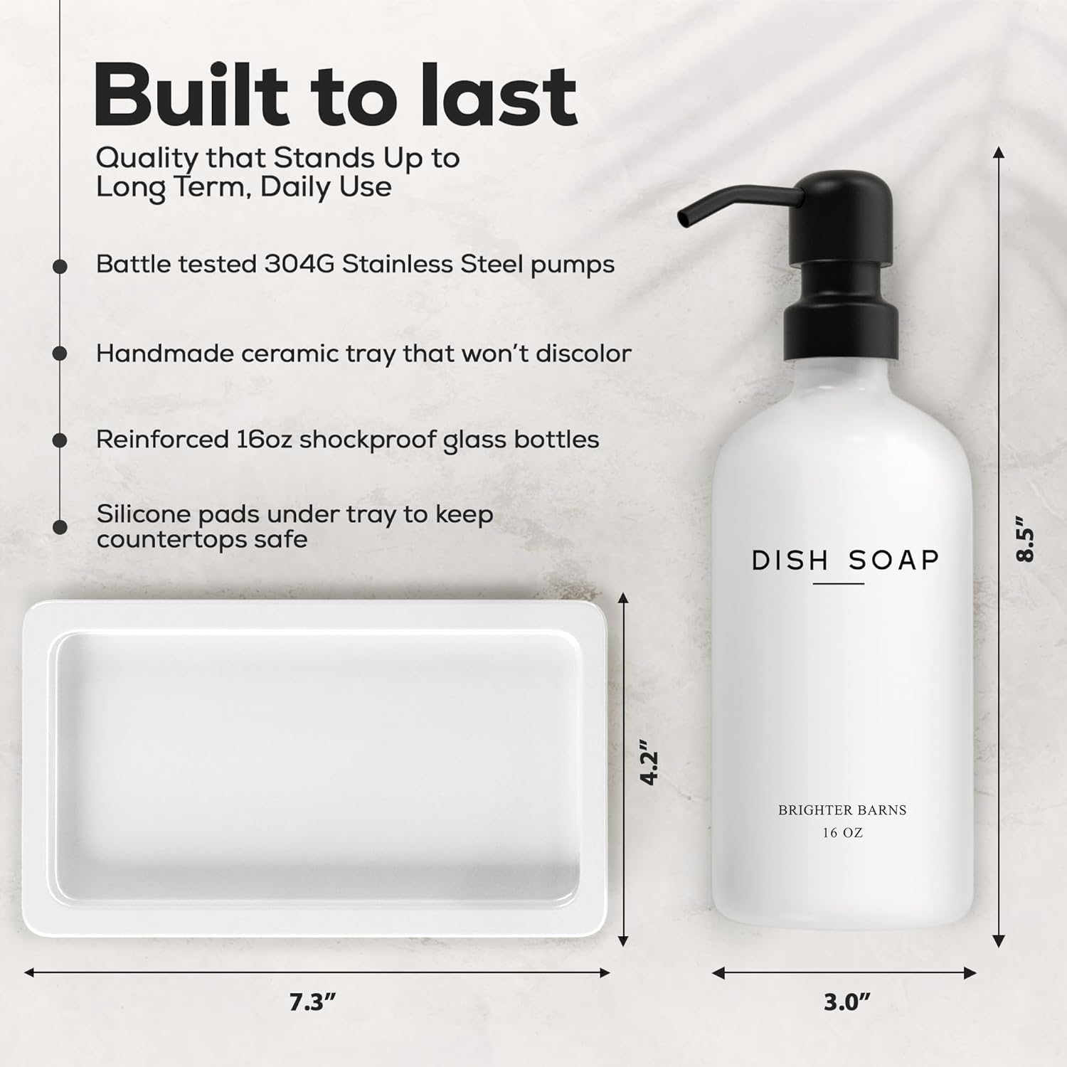 • AMERICAN DESIGN, UNCOMPROMISING QUALITY - Crafted with meticulous attention to detail, our glass soap dispenser with pump set features 2 robust 16oz glass bottles, corrosion-proof 304G stainless steel pumps, and a stain-resistant ceramic tray. All designed in the USA to provide unbeatable quality and enduring style that you can trust.