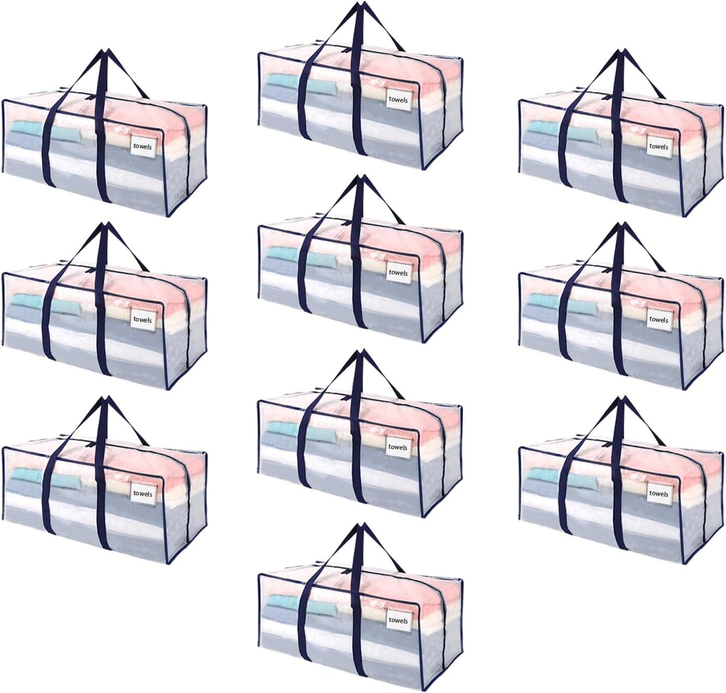 VENO 10 Pack Moving Bags Plastic Storage Totes Clothes Organization Large W Lid/Zipper. Packing Boxes/Bins Alternative. Space Saving Foldable College Supplies Essentials (Clear, 10 Pack)