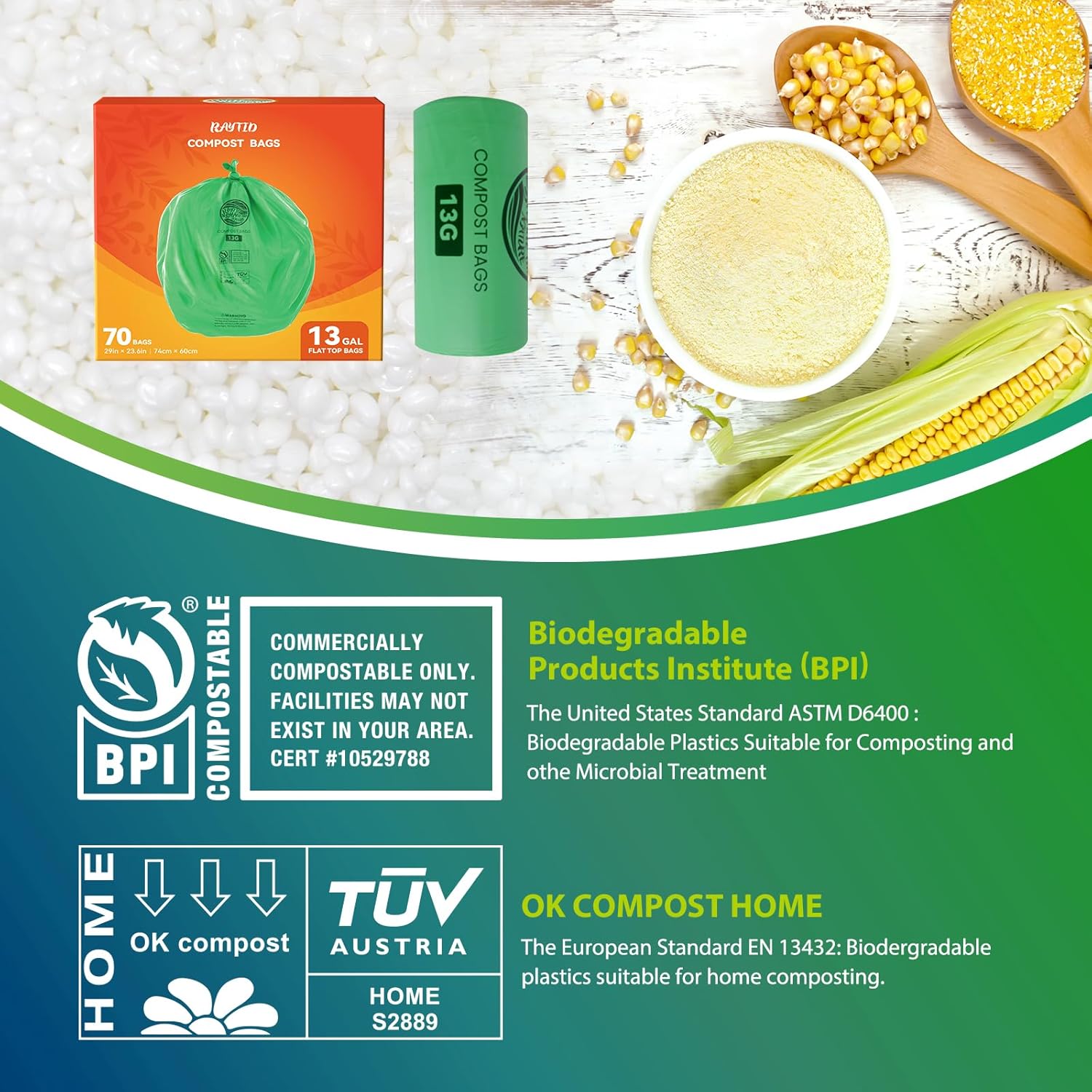 • RAYTID compostable bags are certified by BPI Compostable (ASTM-D6400&EU EN13432 standard) and OK Compost HOME (EU Standard). All professionally managed composting facilities are able to accept our compostable trash bags. Use these compost bin bags to collect kitchen scraps and put them straight into the compost bucket without ripping, turn them into organic-rich soil for gardening or household plants with leak proof but no mess and smell